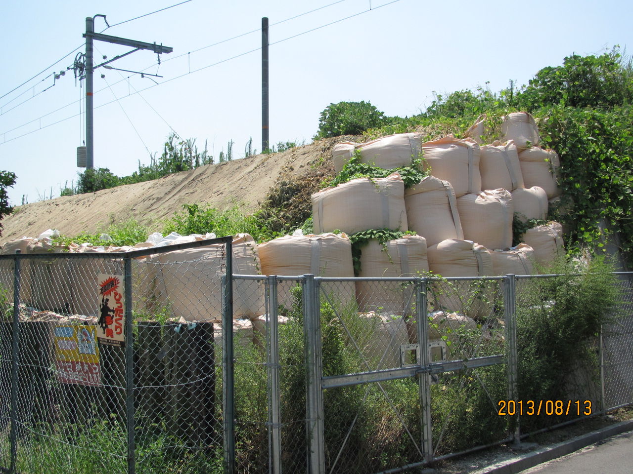 斜面には、土のうが積まれています。
