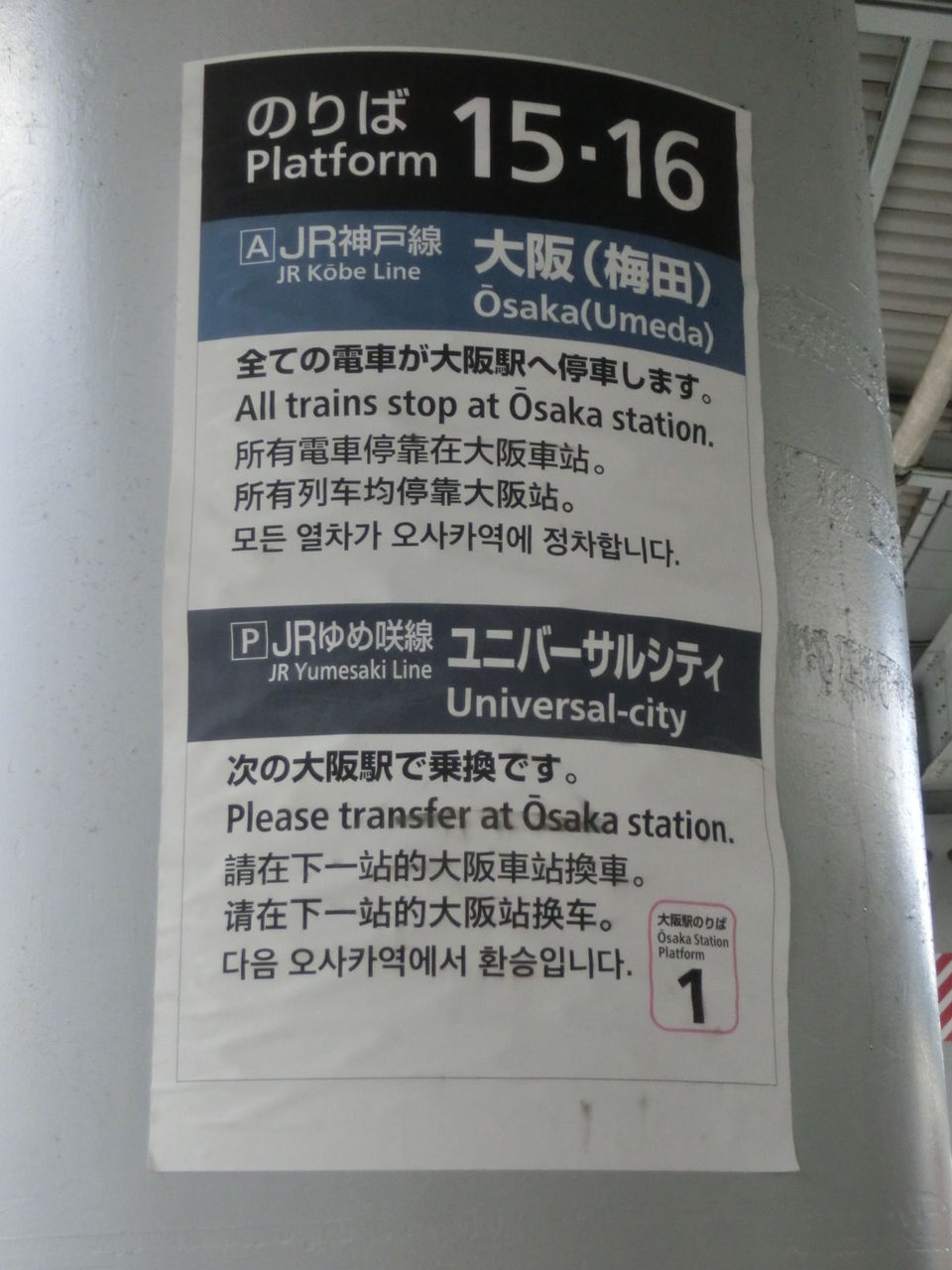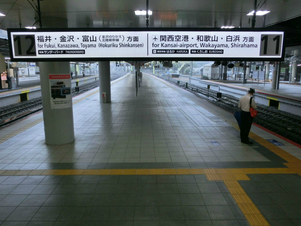 大阪側の階段前にある案内看板も、11・12番のりばと同様 既に更新済みで、変更前の のりば番号が書かれたシールが貼られていました。
