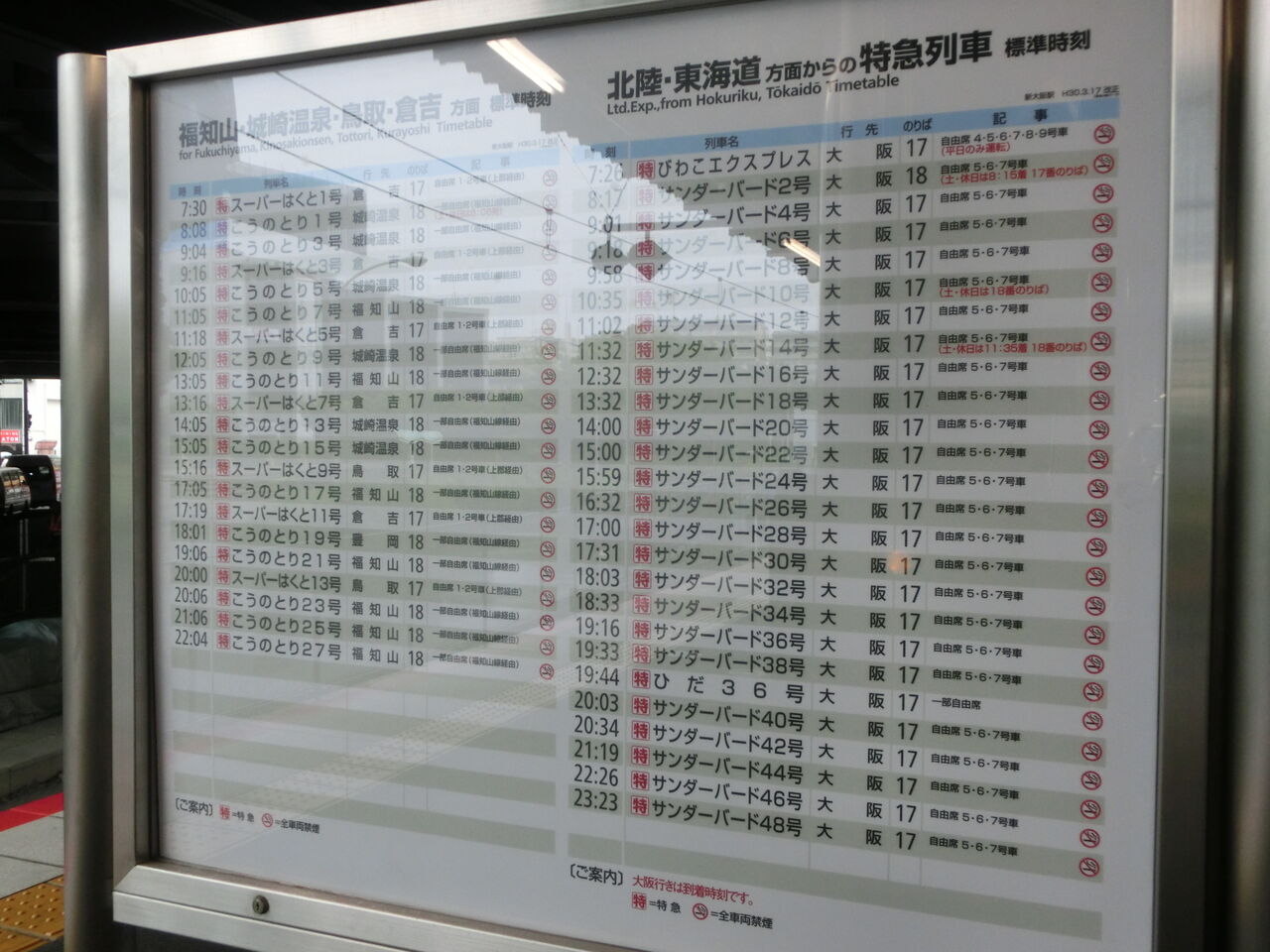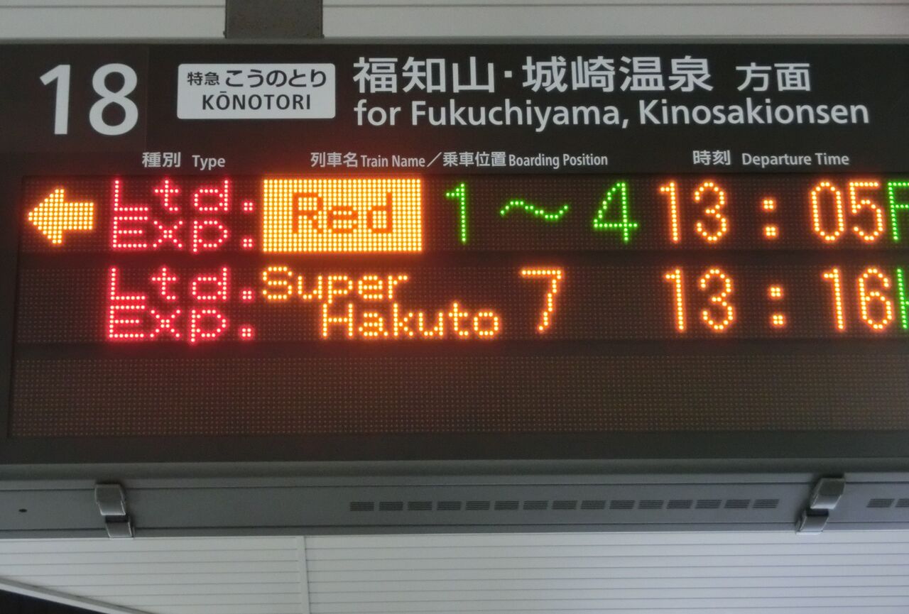 18番のりばに停車中の特急こうのとり。 かつて 「しらさぎ」 で使われていた車両(289系)です。