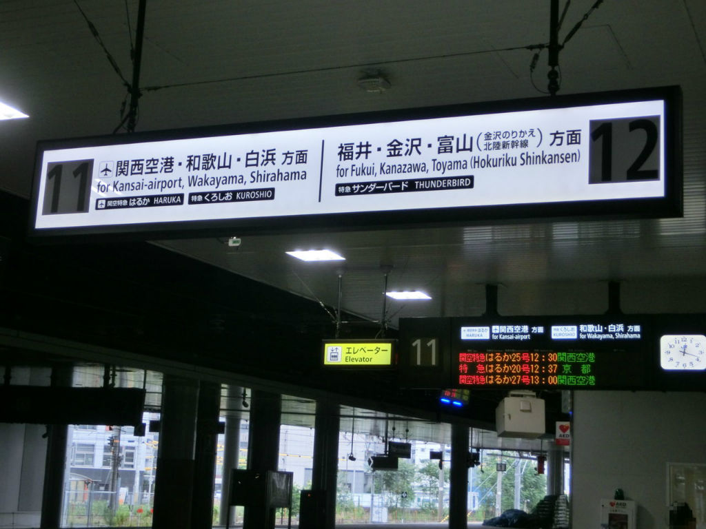 まずは、11・12番のりば 京都側の階段を下りたところにある LED発光型の案内看板から。