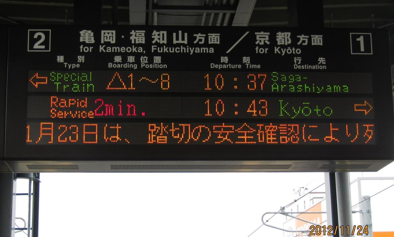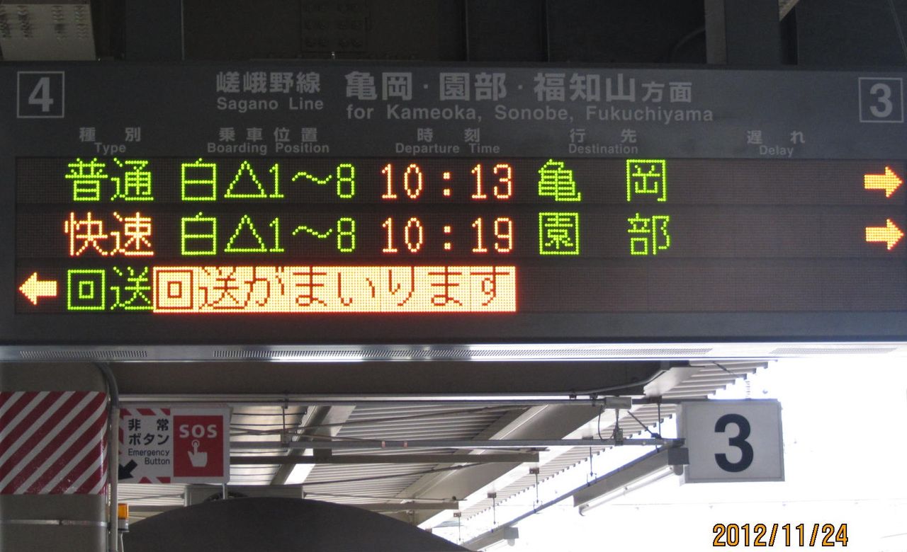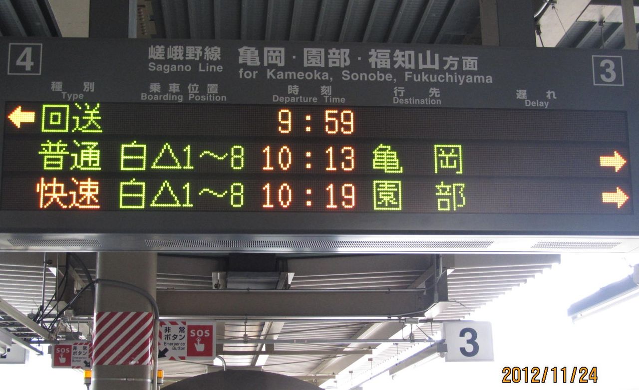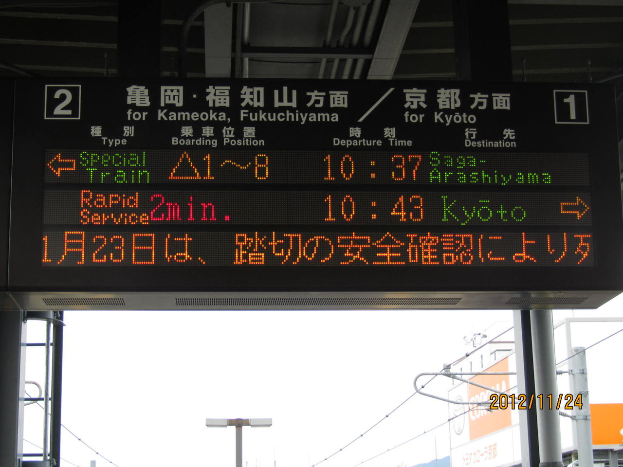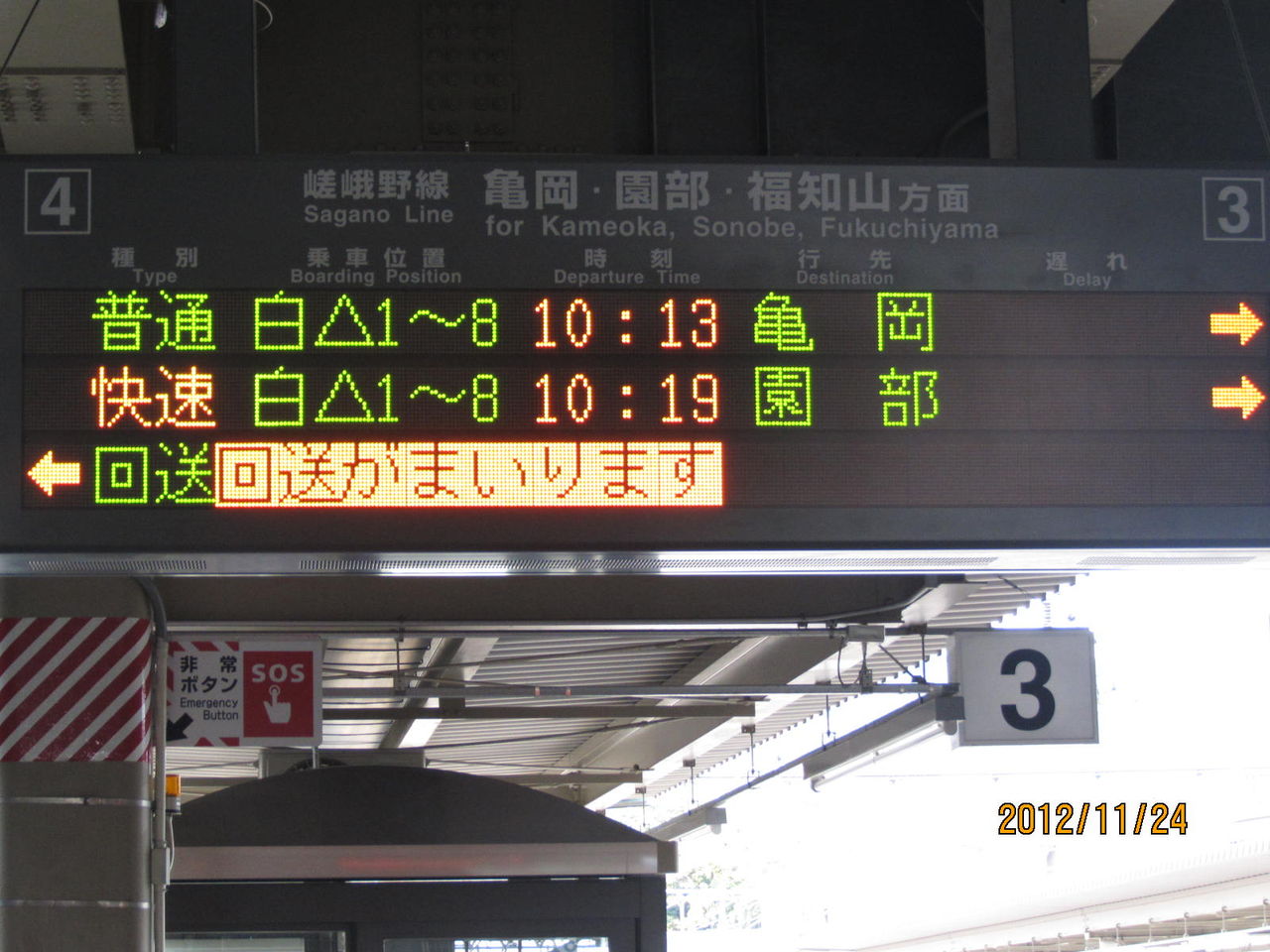 今回は、そんな嵯峨嵐山行きの接近放送と電光掲示板の表示をご紹介。