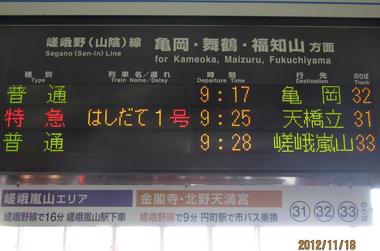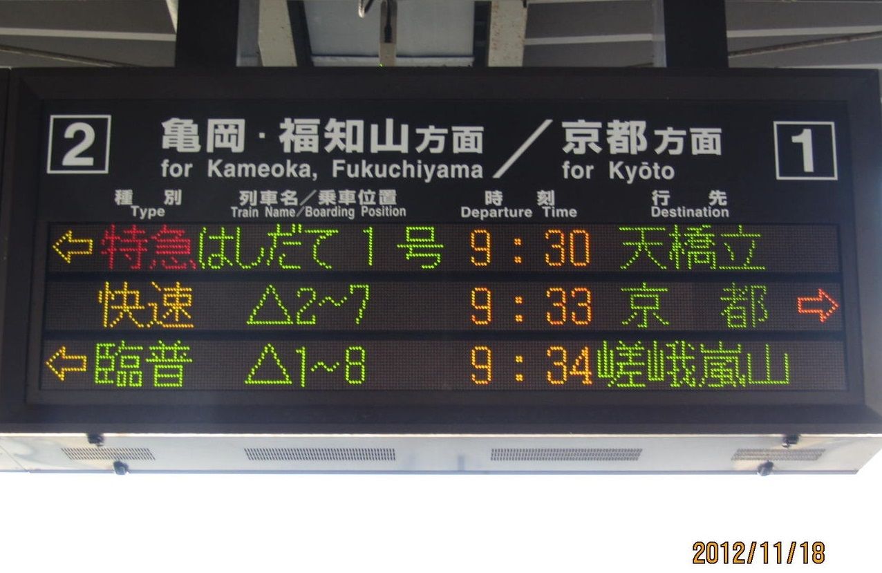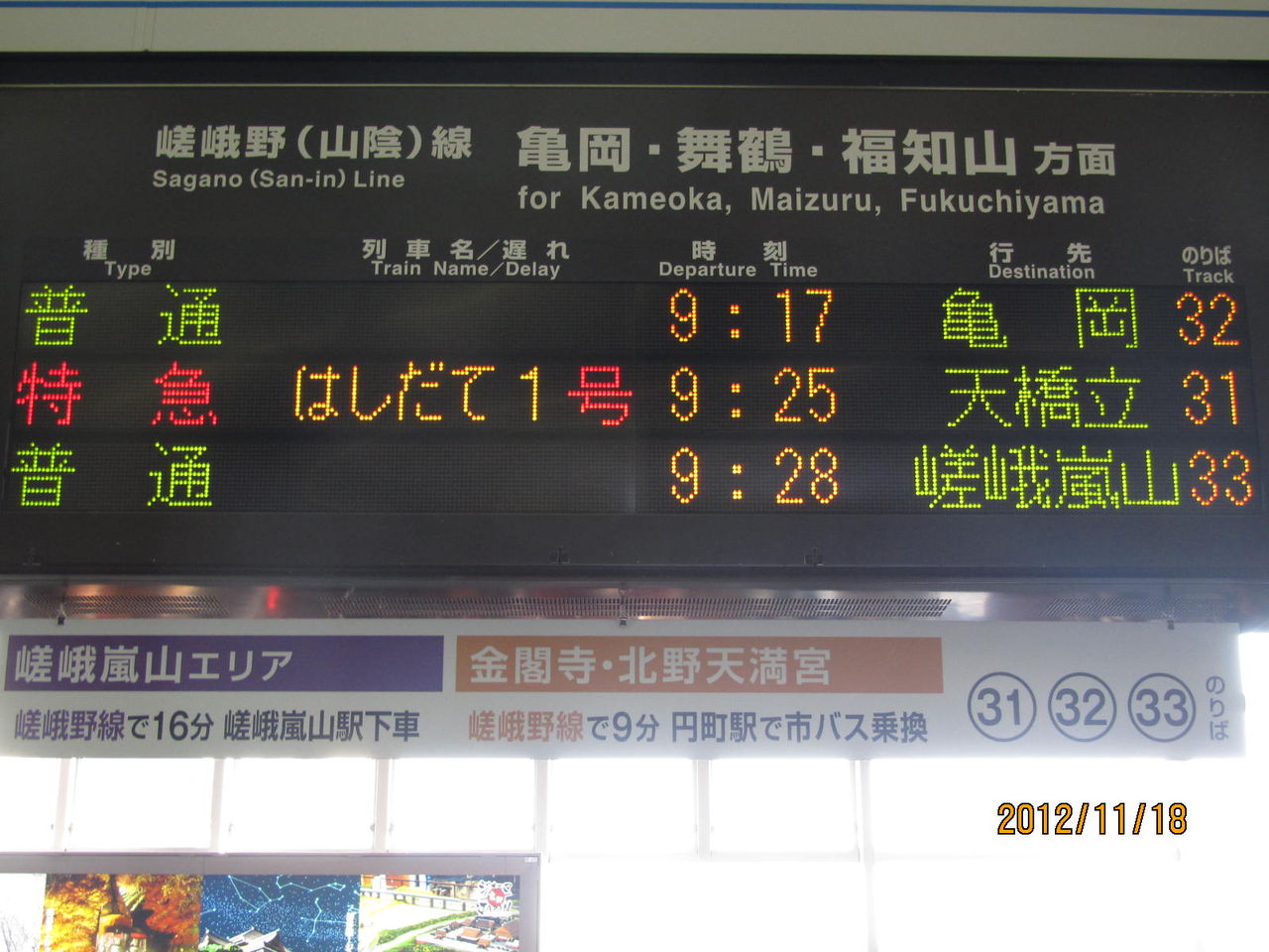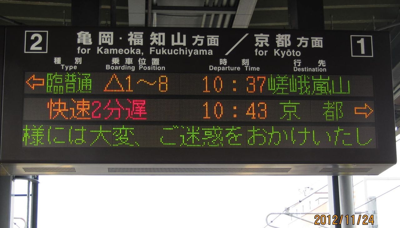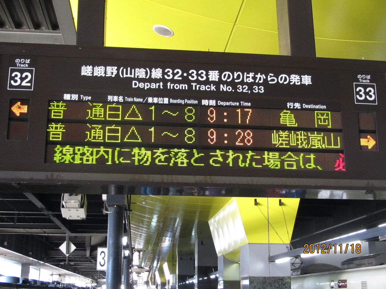 今回は、そんな嵯峨嵐山行きの接近放送と電光掲示板の表示をご紹介。
