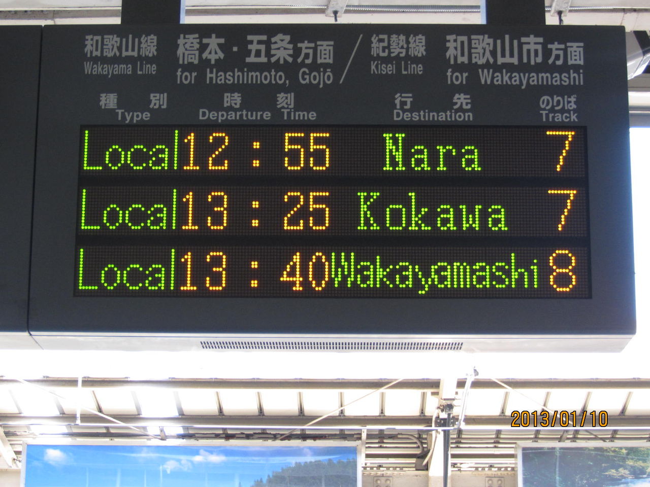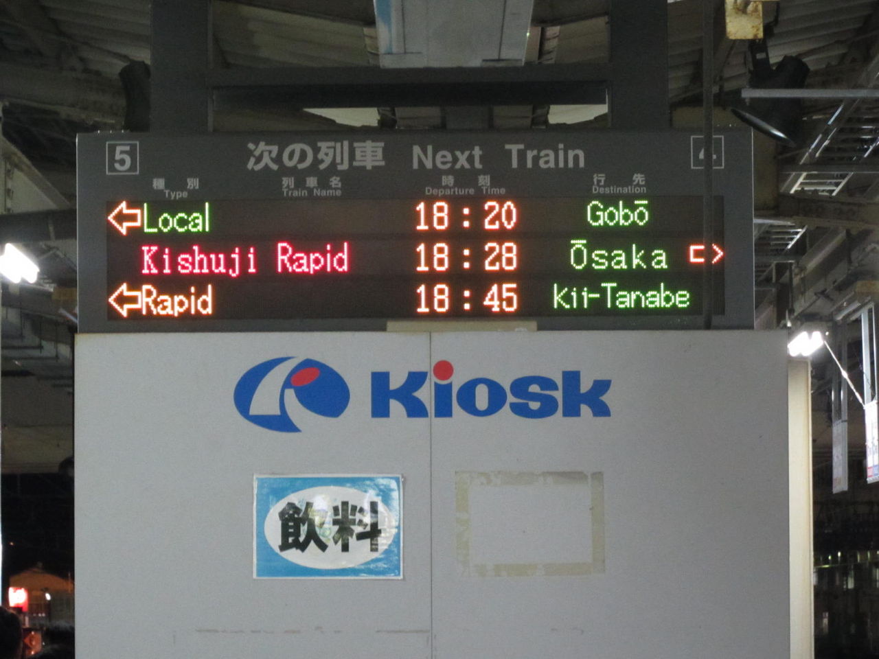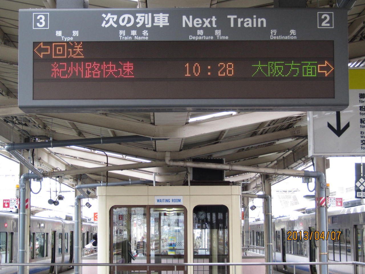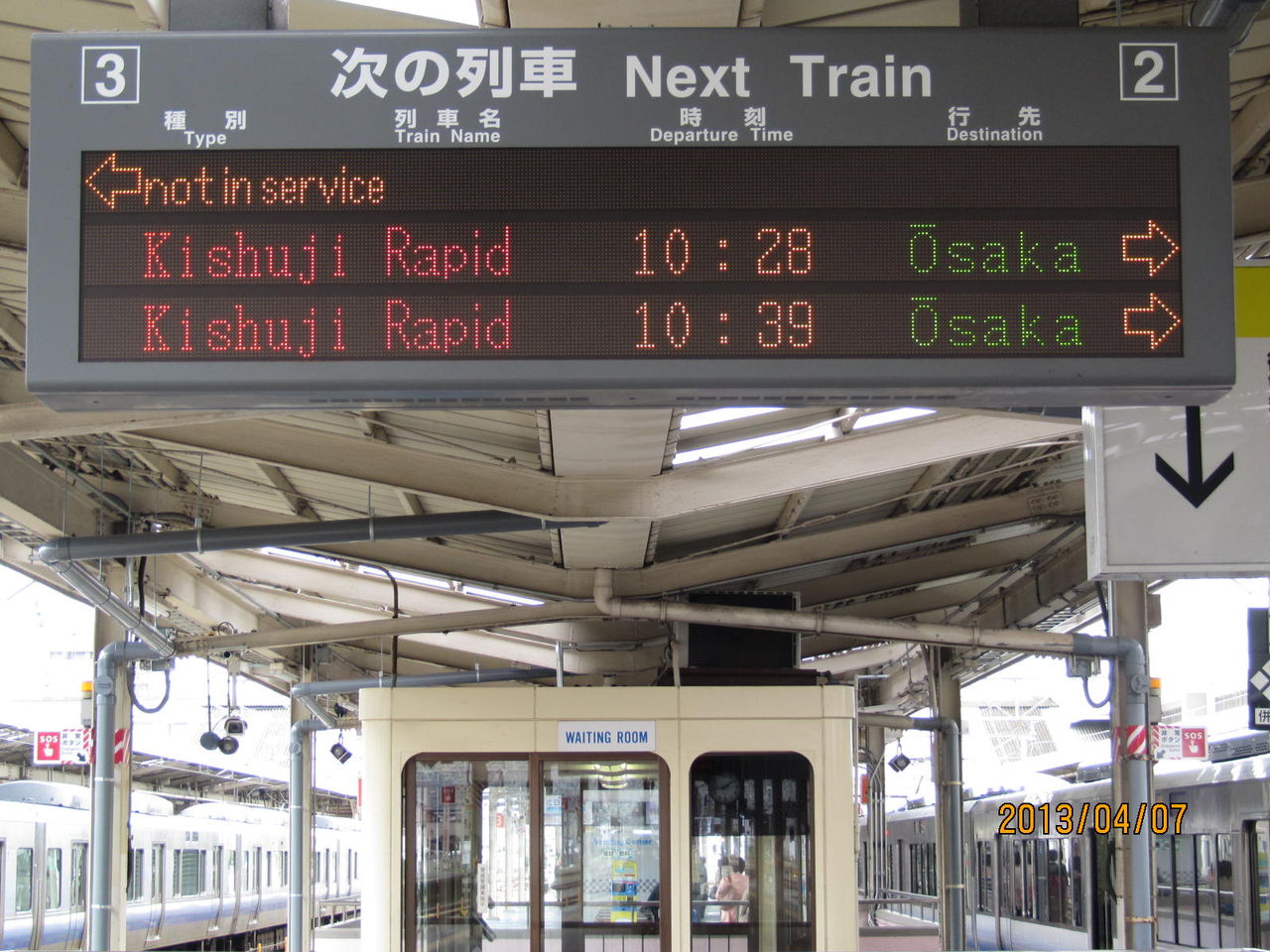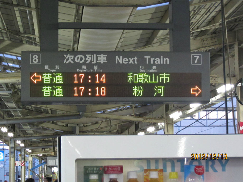 和歌山駅の電光掲示板には、写真のように 次の列車 Next Train と書かれています。