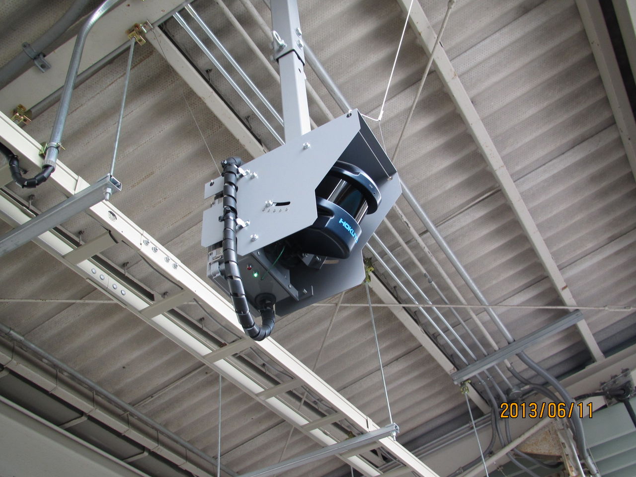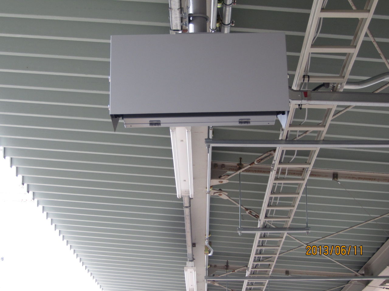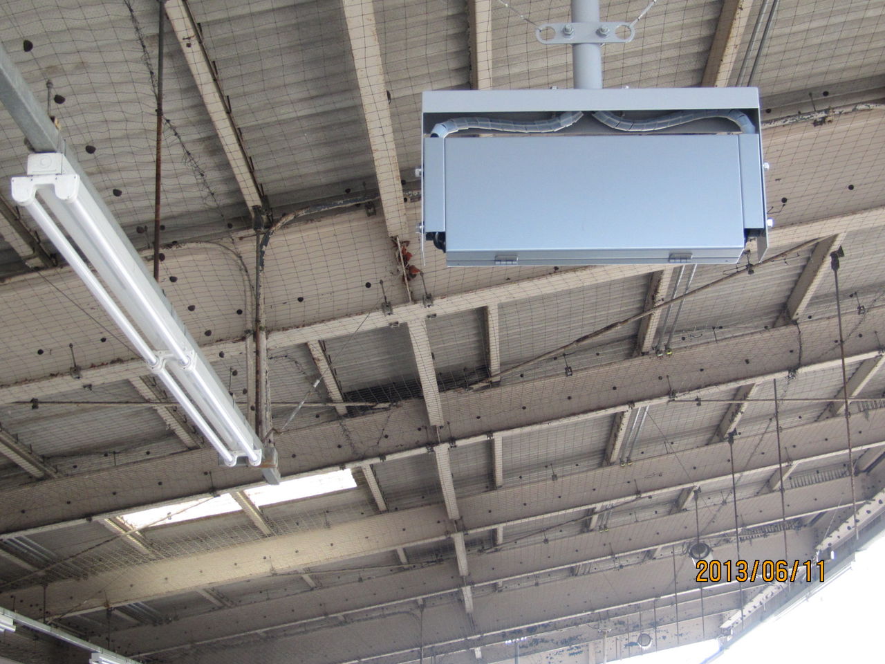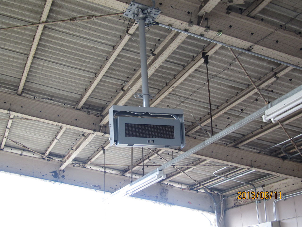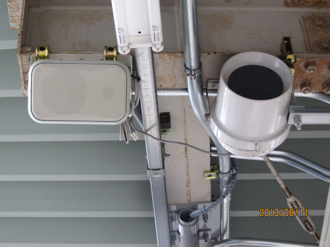 上の方に目をやると、現在使われている丸型のスピーカーの他に、長方形の白いスピーカーが 新たに設置されていました!