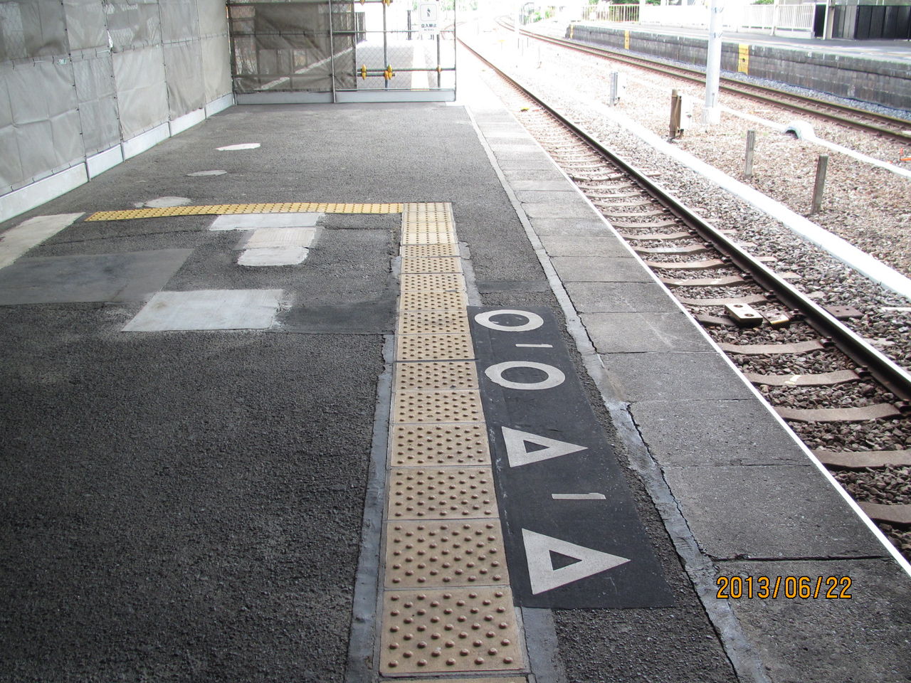 黄色い点字ブロックの外側に、乗車位置を消した跡があることからも、かつて この位置に電車が停車していたことが分かります。