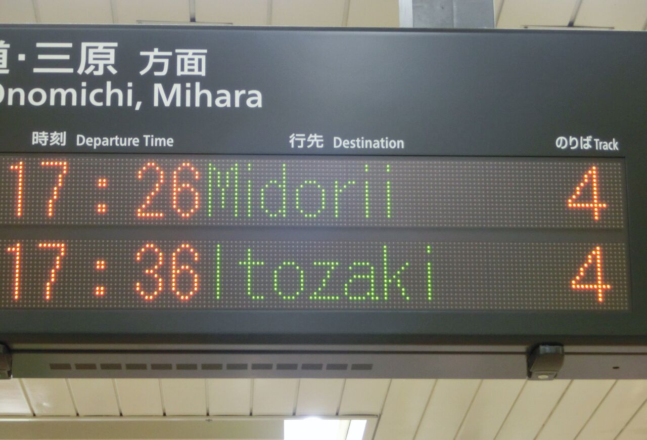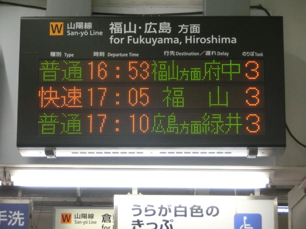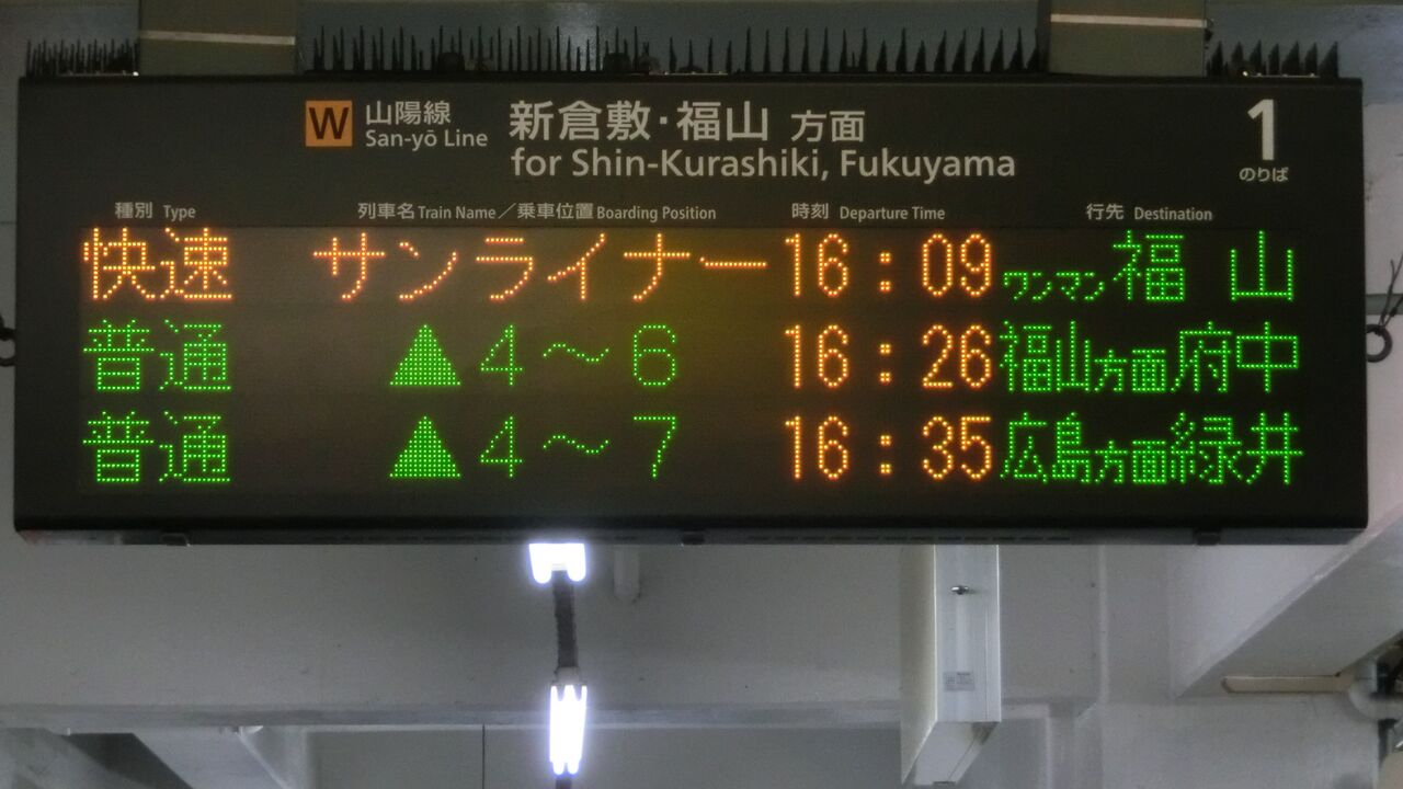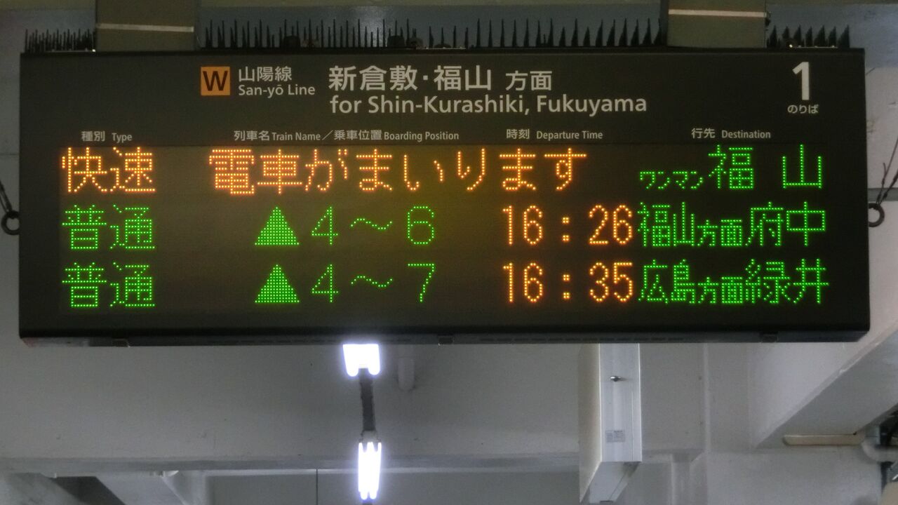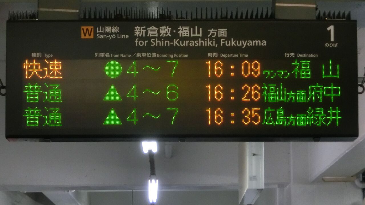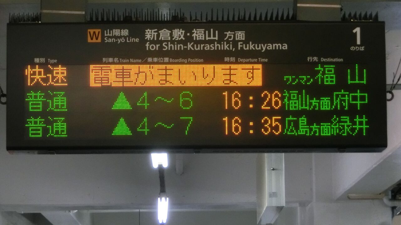 そこで、今月(2018年3月)、倉敷・笠岡・福山の3駅を訪れ、発車標に表示された 緑井行きを撮影してきました。