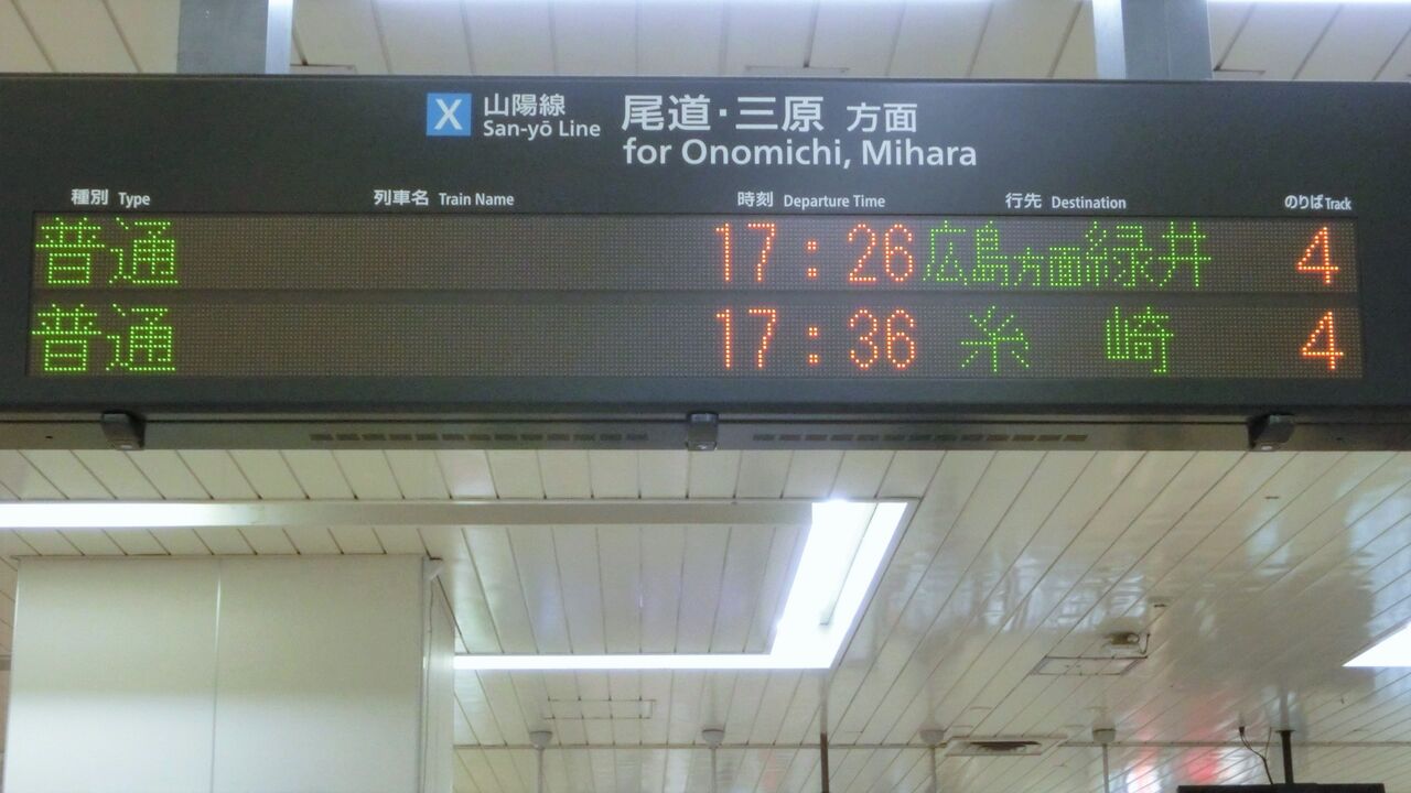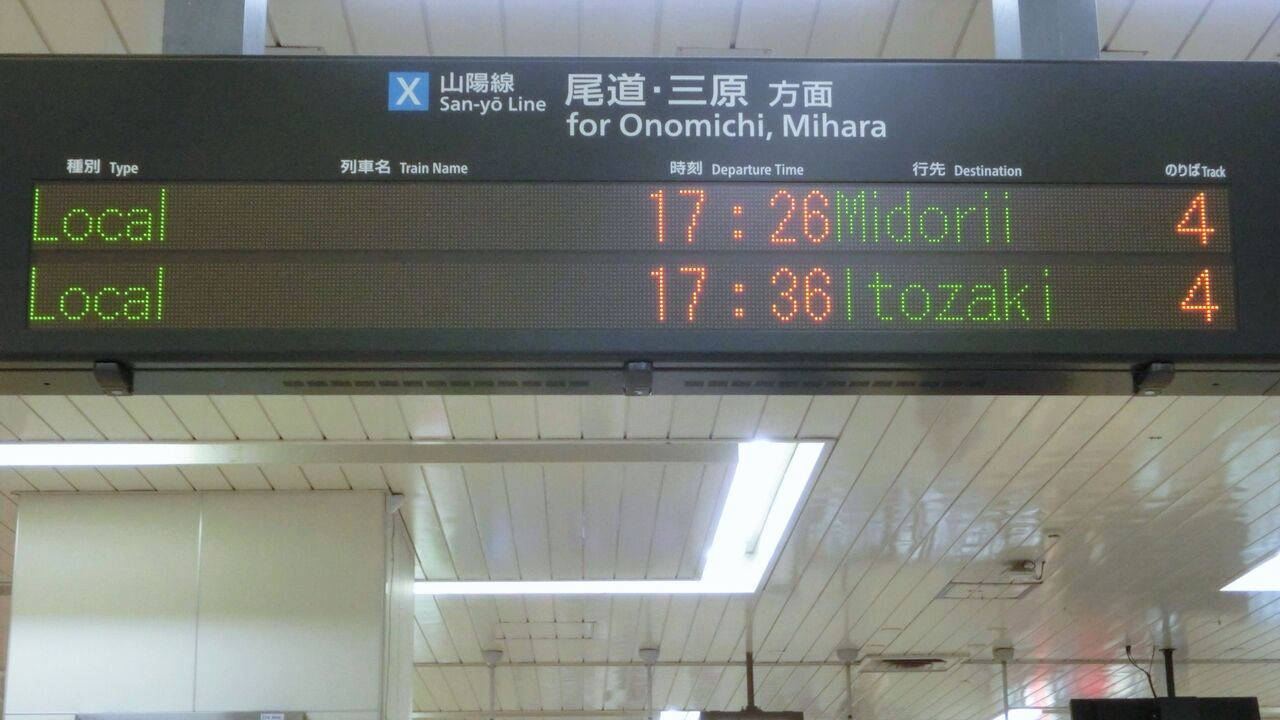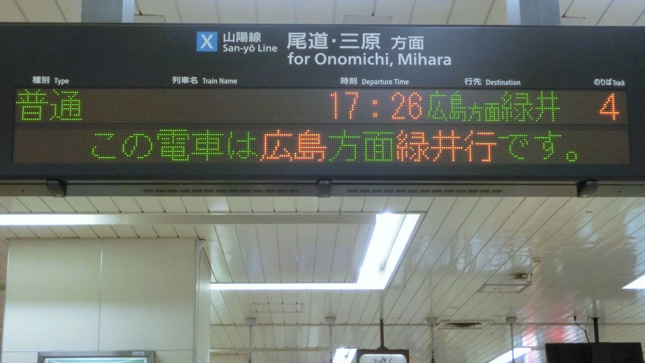 そのためか、山陽線 岡山~糸崎駅間の各駅では、広島駅を越えて運転される電車の行き先に 「広島方面 」 を付けて案内するようになりました。