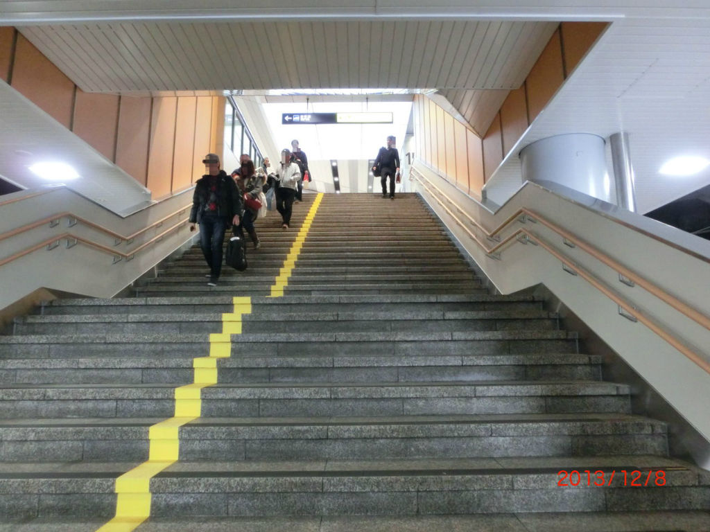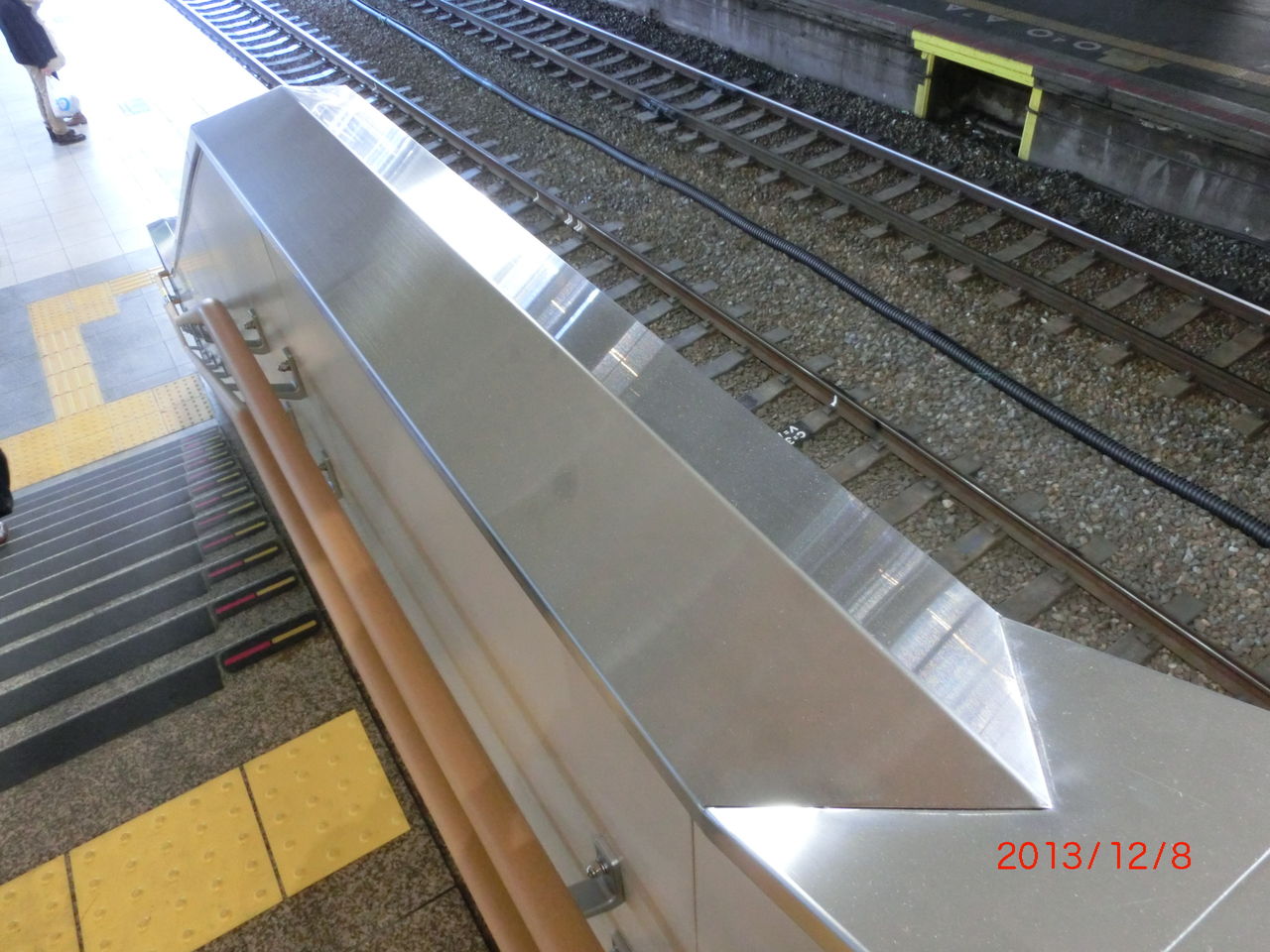 大阪側の階段の踊り場では、平らな手すり(?)が三角形になっており、物が置けないようになっています。
