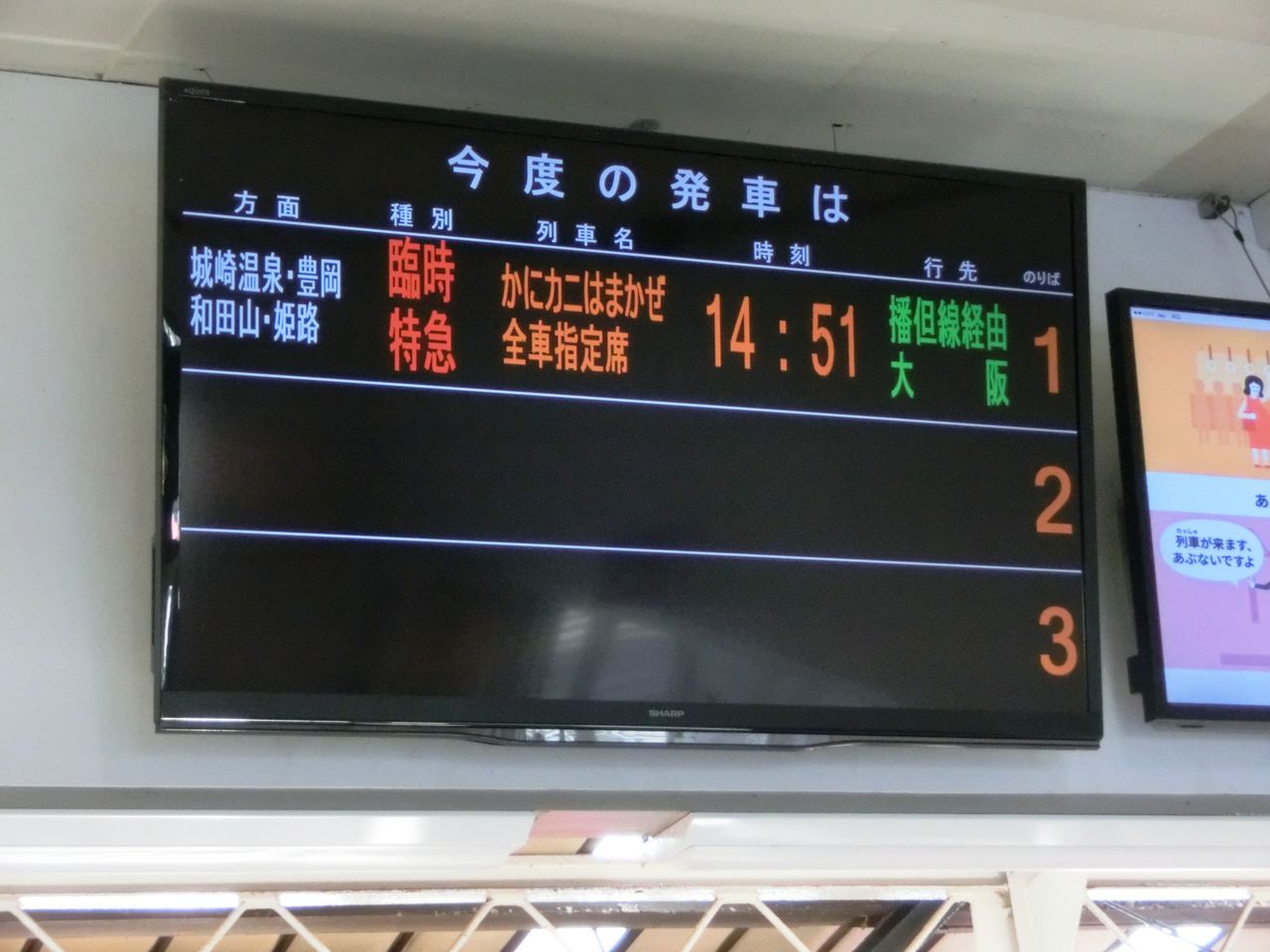 しかし、2016年3月に再び寺前駅を訪れると、ホームや改札口に設置されている発車標が新しいものに取り替えられていたので、2016年12月に改めて 「かにカニはまかぜ」 の表示を撮りに行きました。