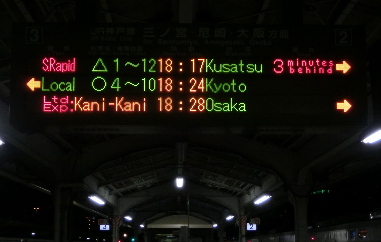 英語表示は、列車名欄が 通常の 「はまかぜ」 と同じ 「Hamakaze」 から、大阪駅やJR神戸線と同じ 「Kani-Kani」 に変わったほか、両数表示 「4cars」 の 「4」 が、半角から全角に変わっています。