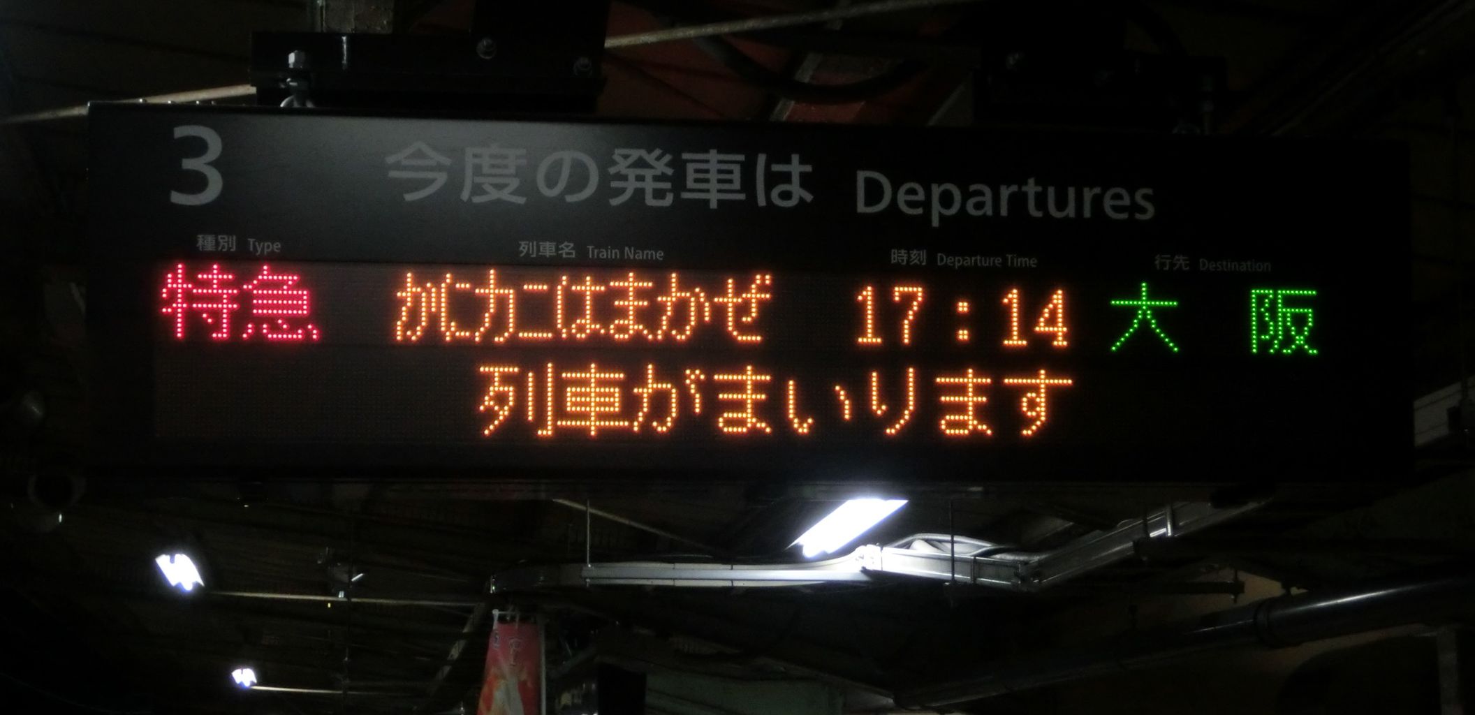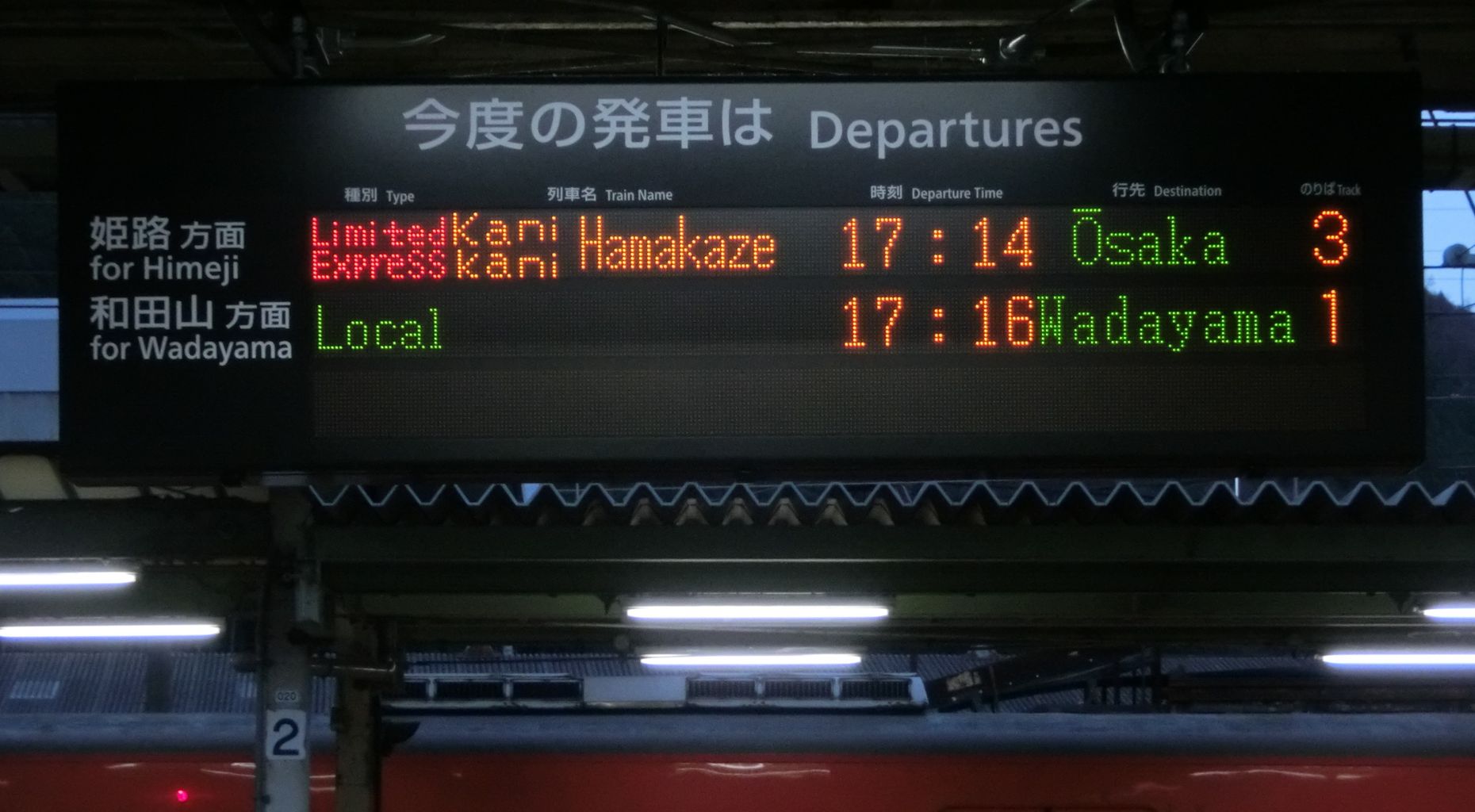 大阪駅のフルカラーLEDの表示とは対照的に 「かにカニ」 の字が小さく、英語表示は 通常の 「はまかぜ」 と同様、「Hamakaze」 でした。