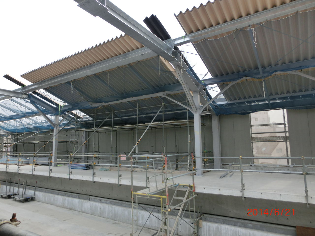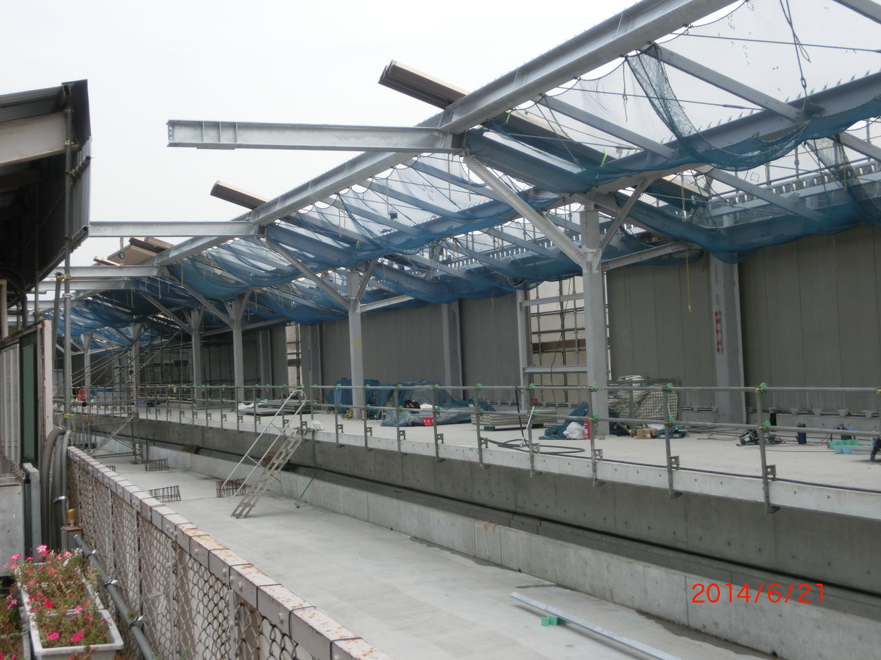 ホームの中程でも、屋根と壁の設置工事が進んでいました。