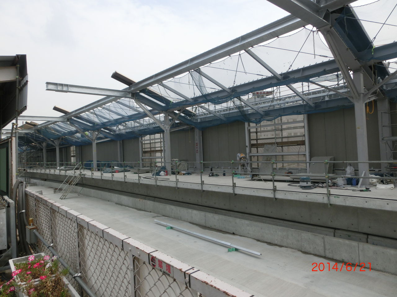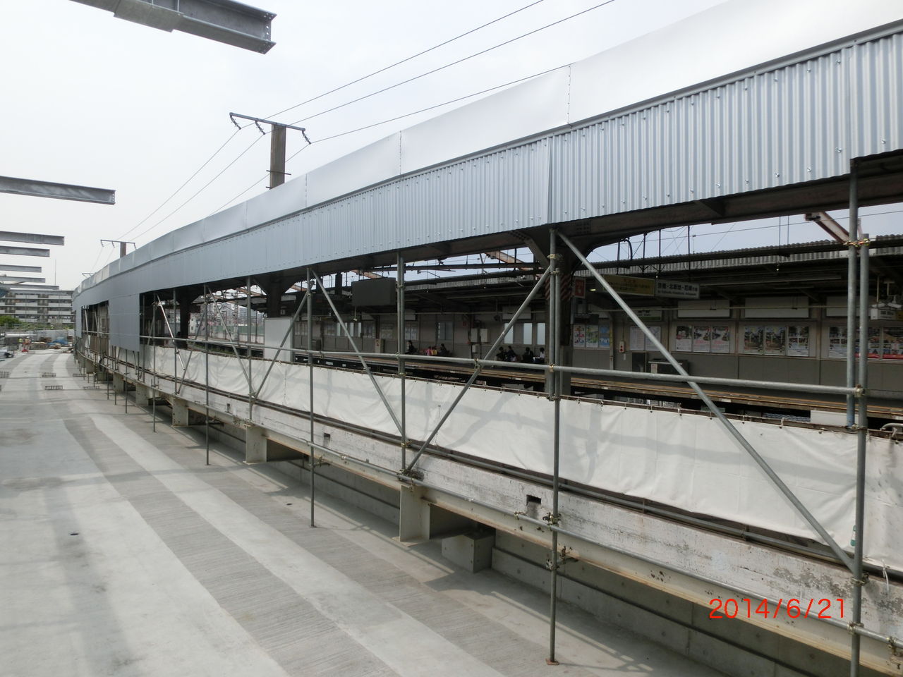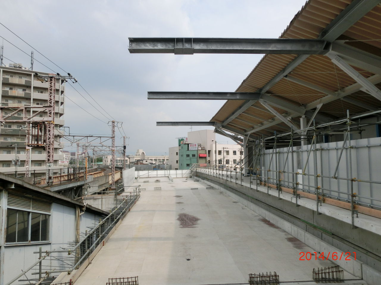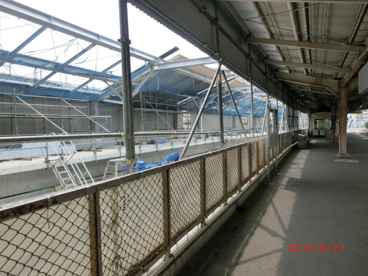 前回の撮影時、2番のりばのホーム屋根が 新しい高架の方に突き出ていましたが、このままだと架線を張るのに邪魔になるため、突き出た部分が撤去されました。