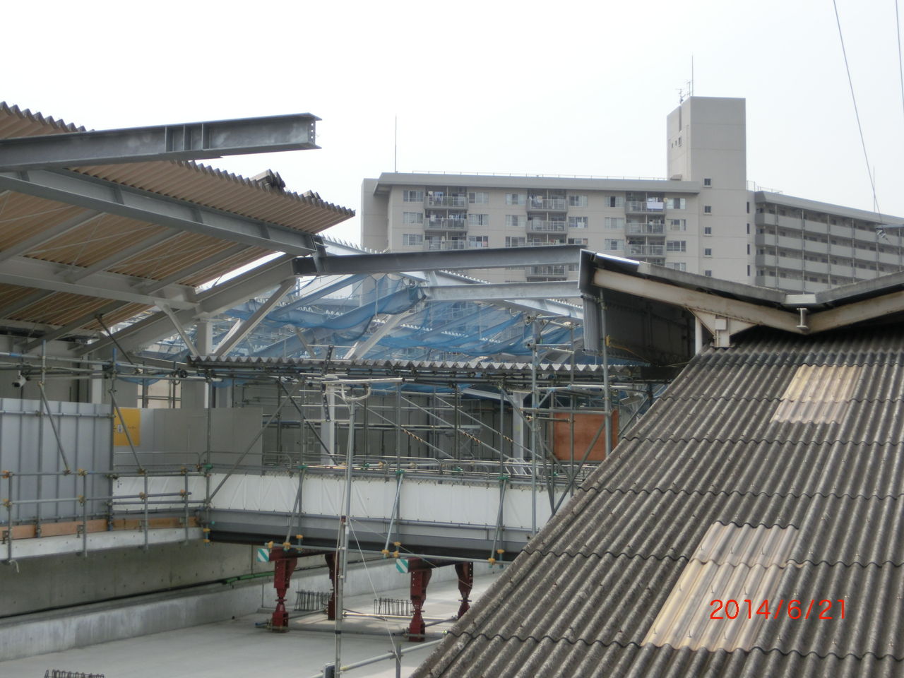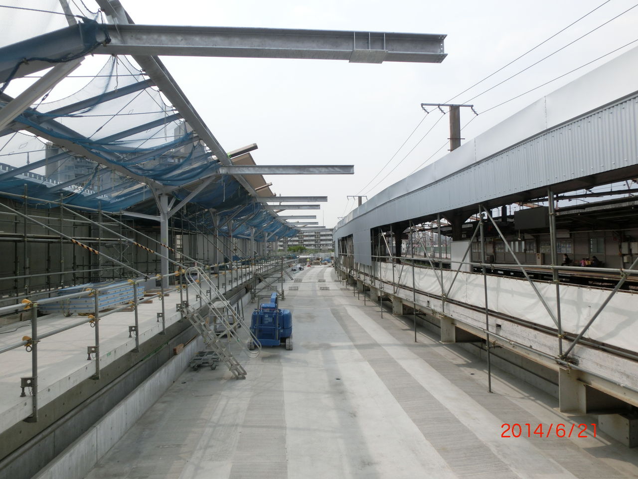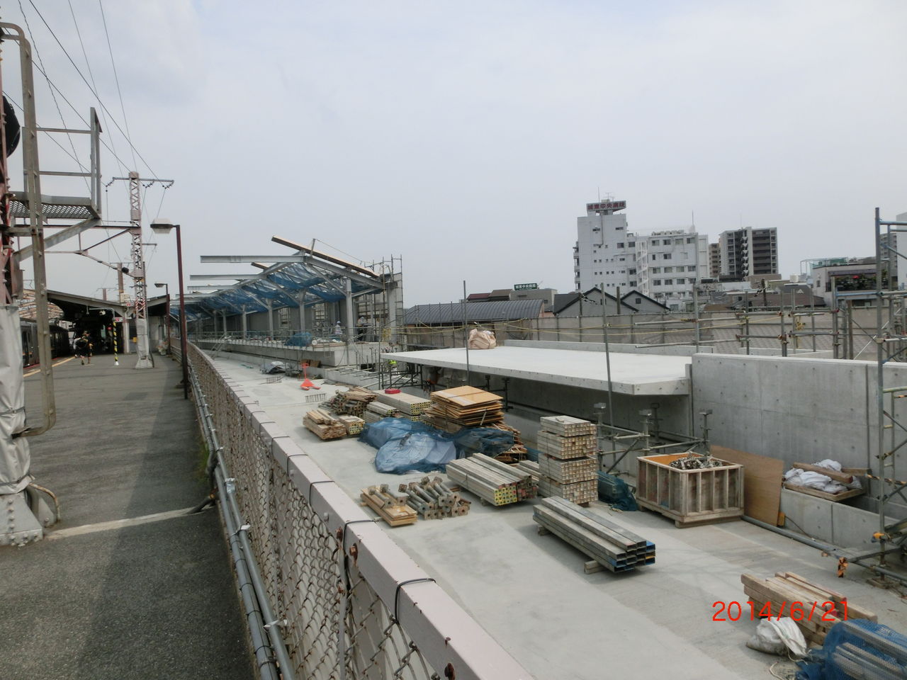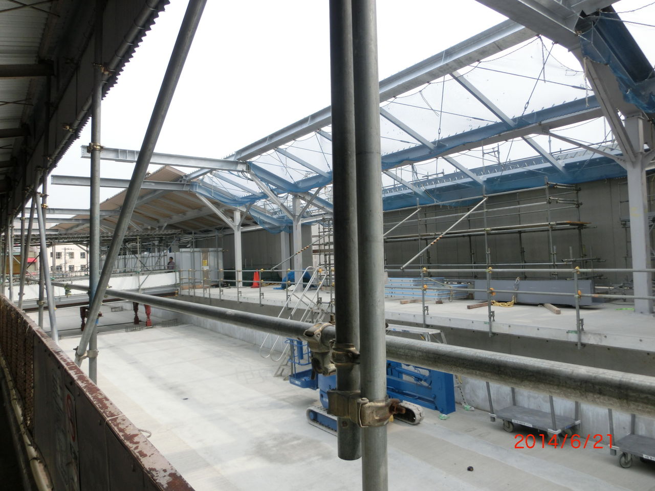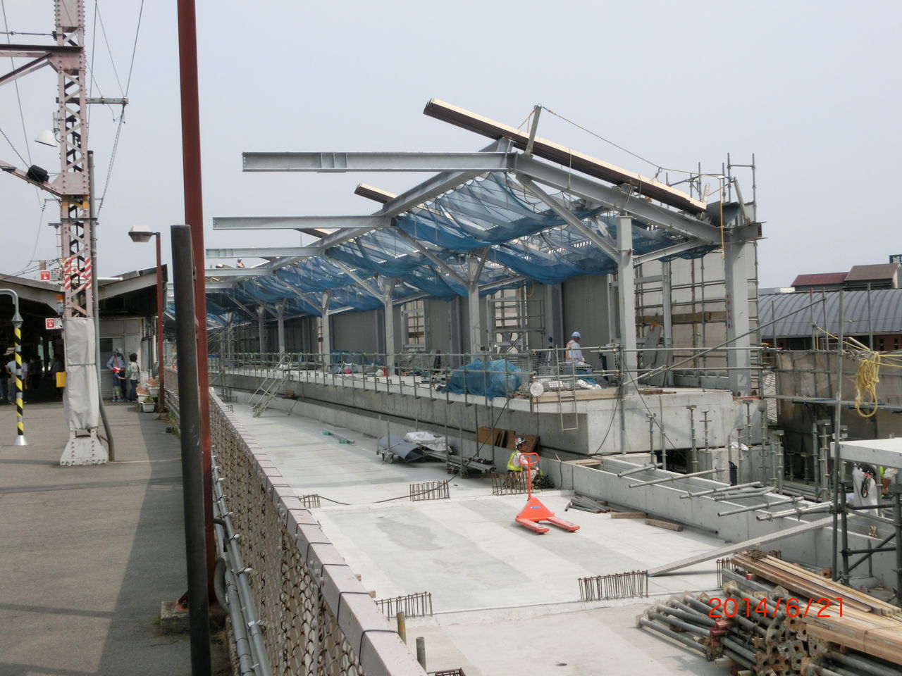 前回の撮影時、2番のりばのホーム屋根が 新しい高架の方に突き出ていましたが、このままだと架線を張るのに邪魔になるため、突き出た部分が撤去されました。