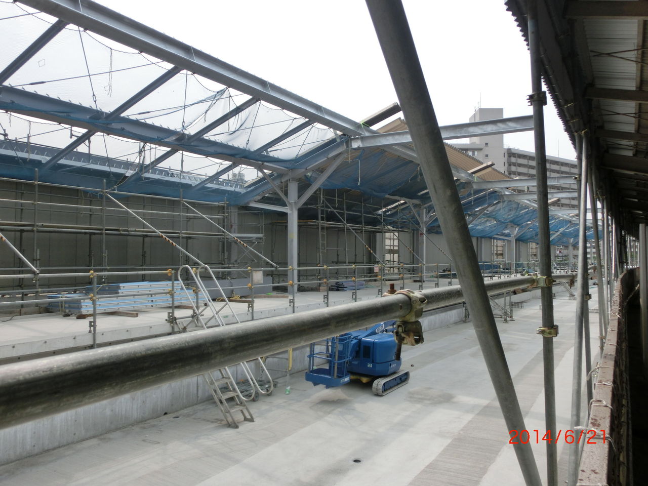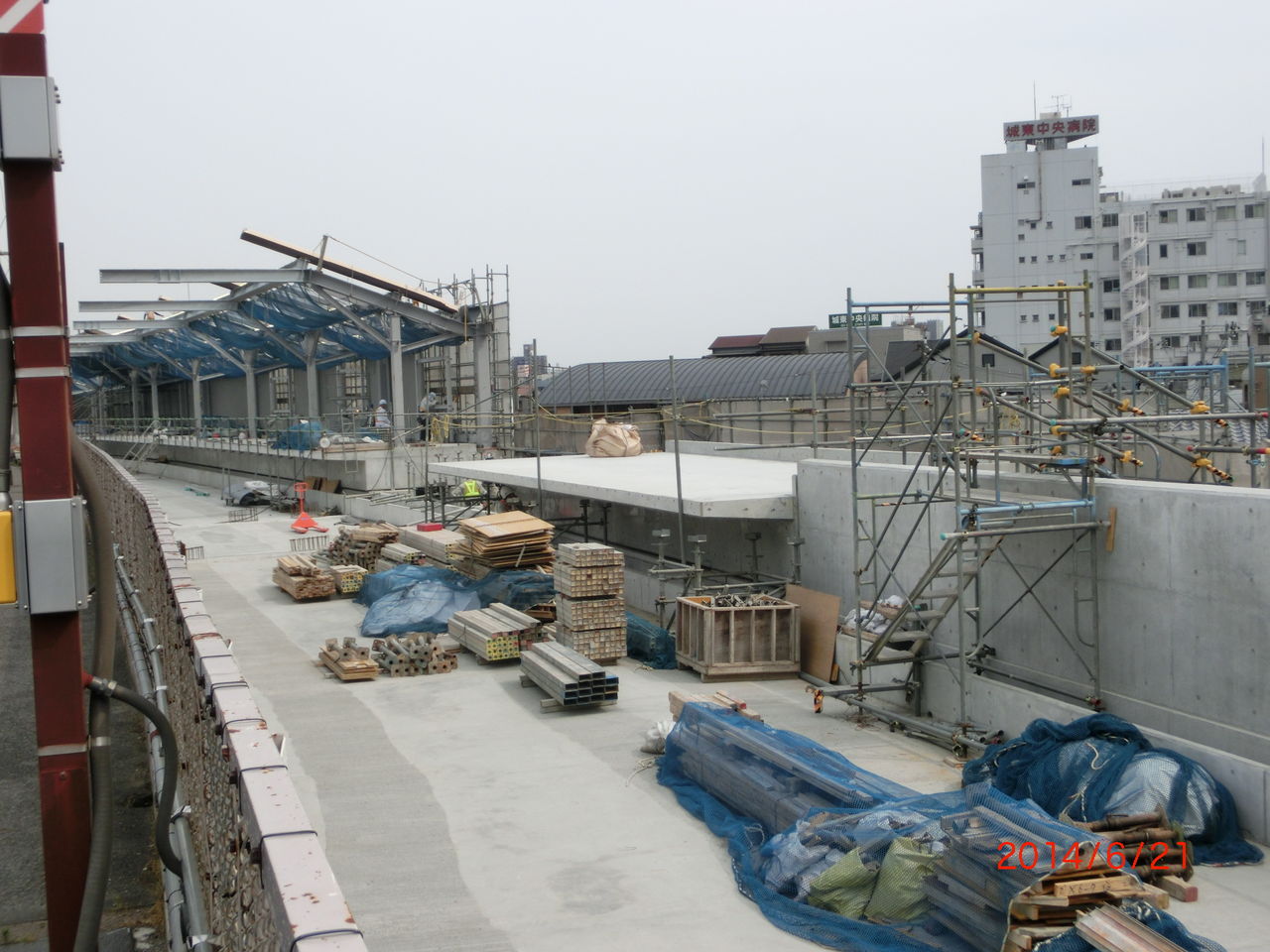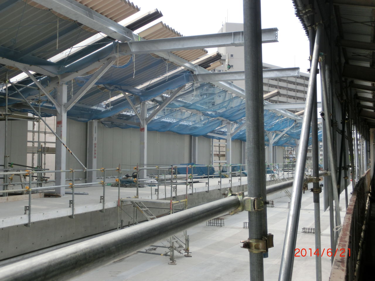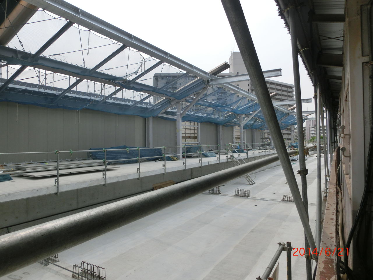 手前に 工事用の細い鉄骨が立てられているのが分かります。