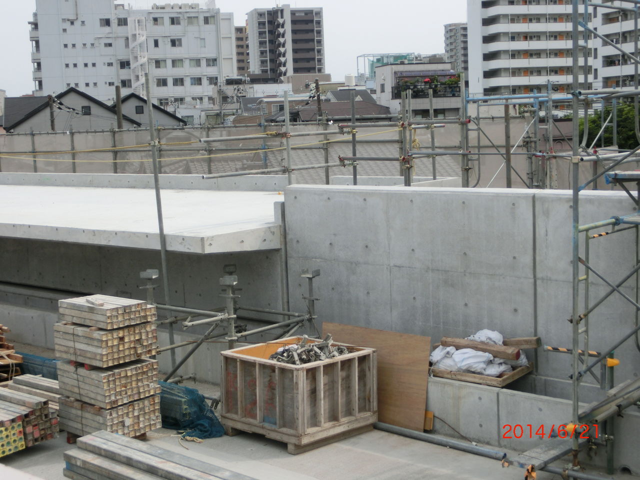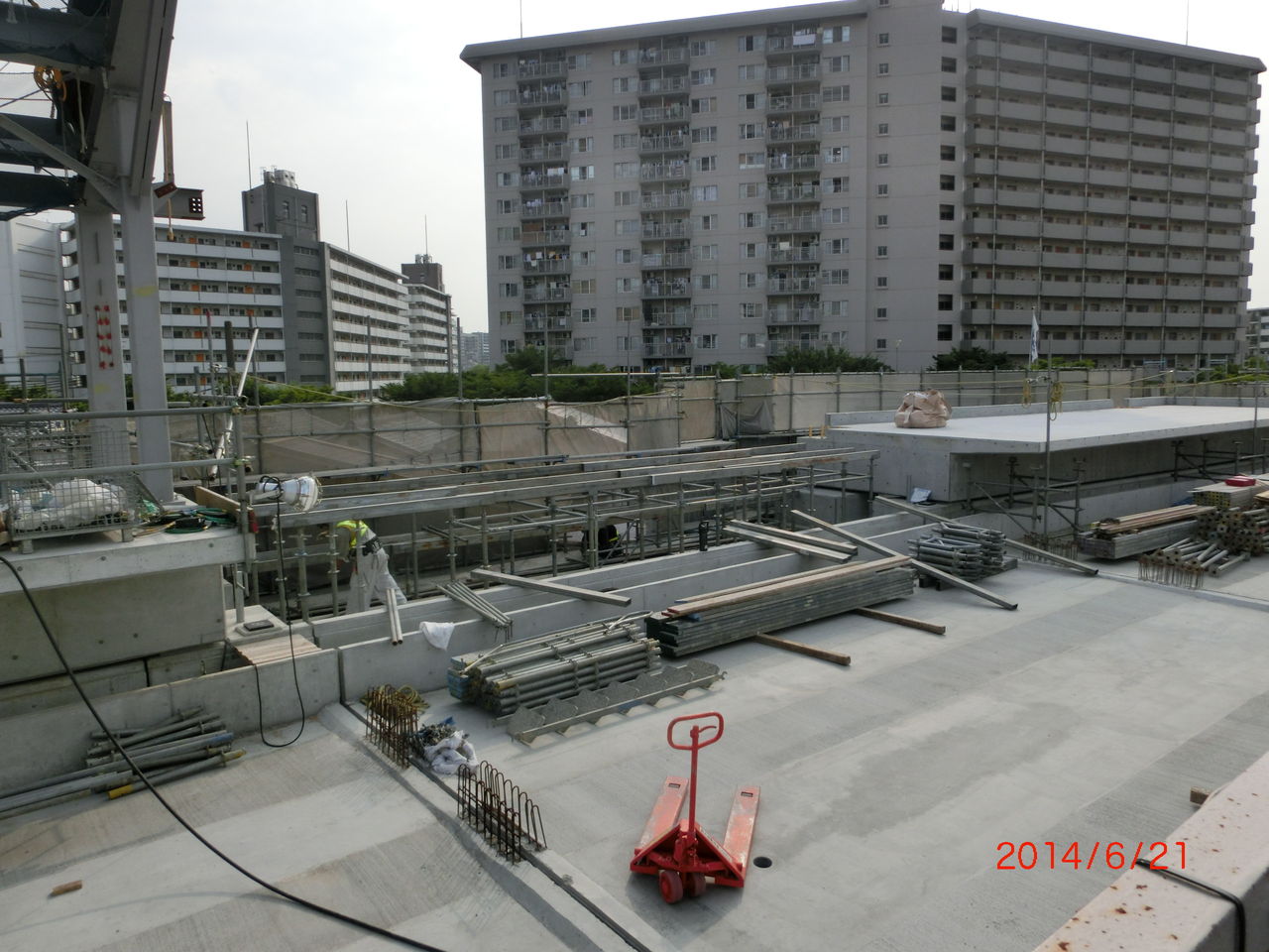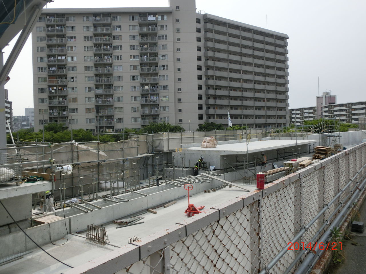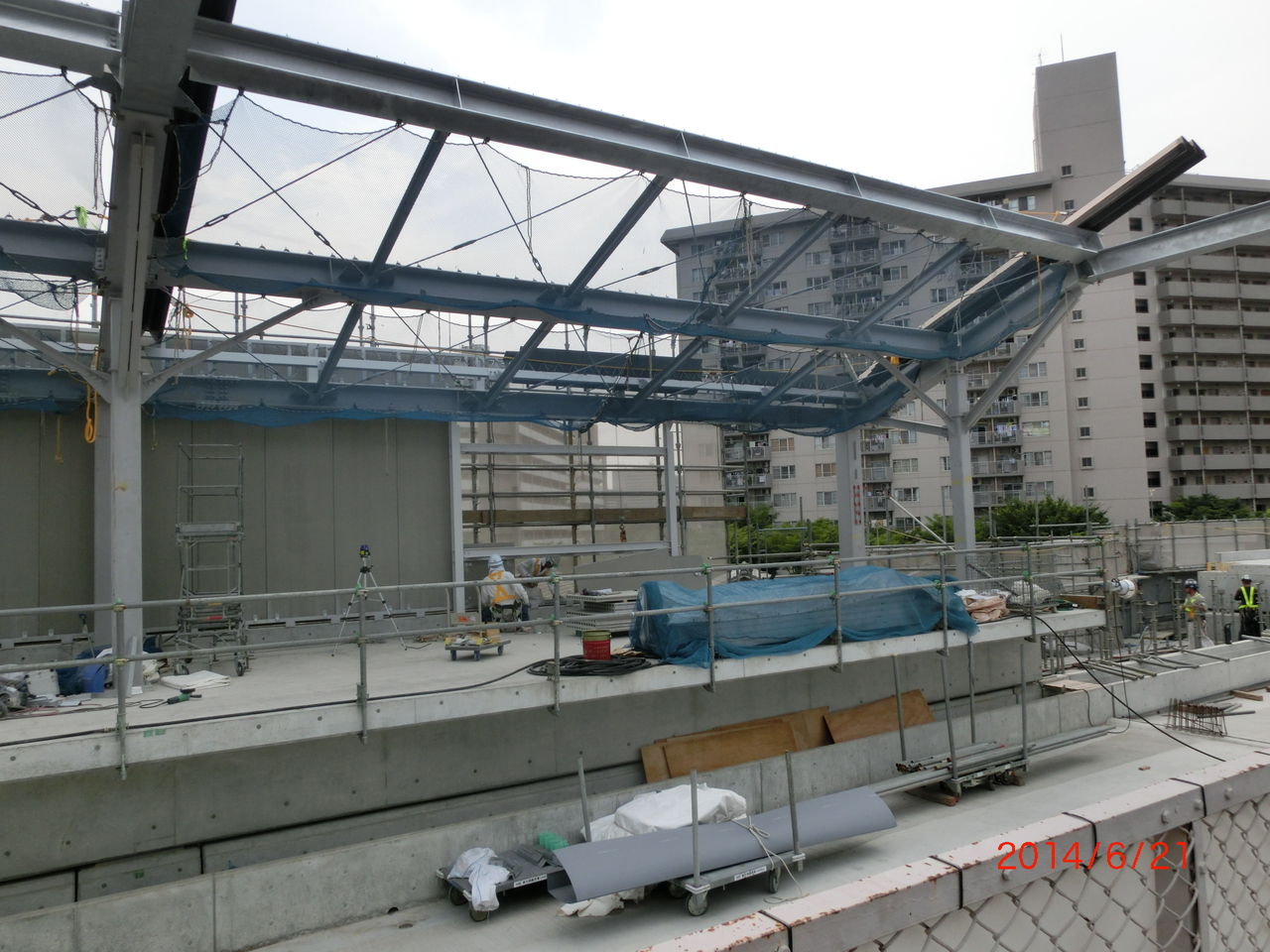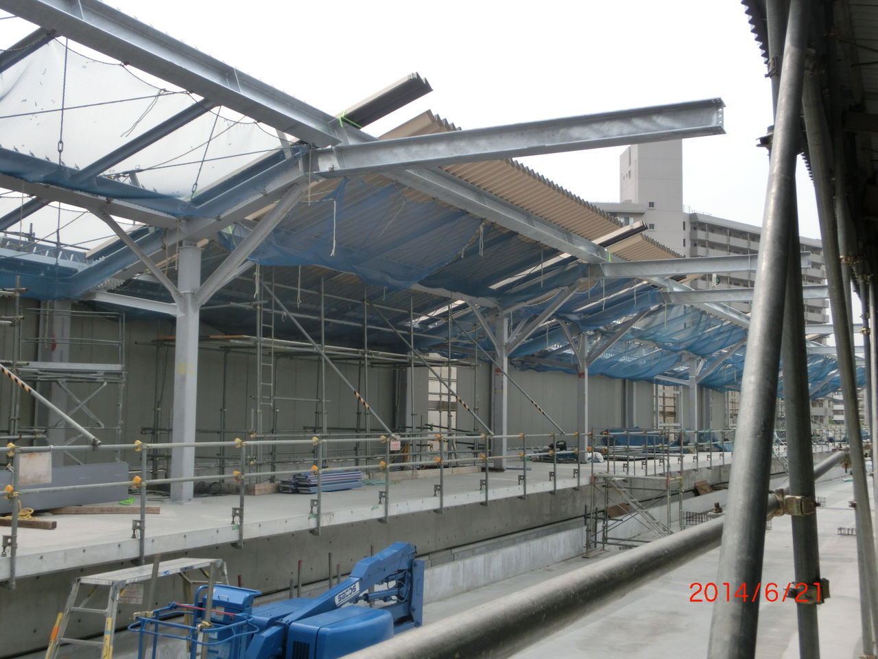手前に 工事用の細い鉄骨が立てられているのが分かります。