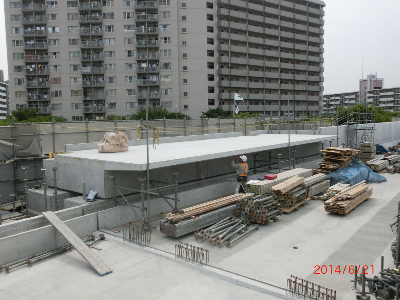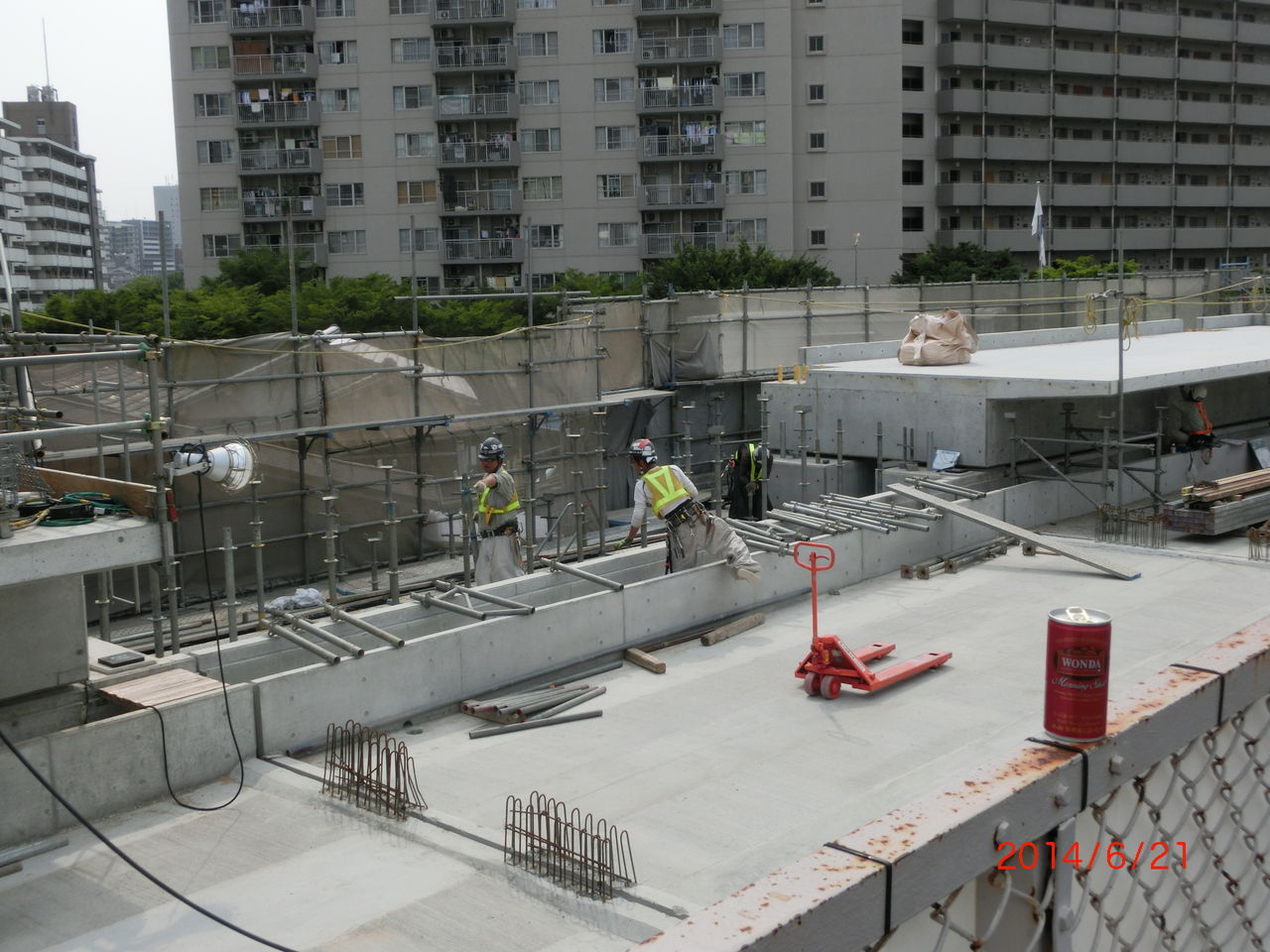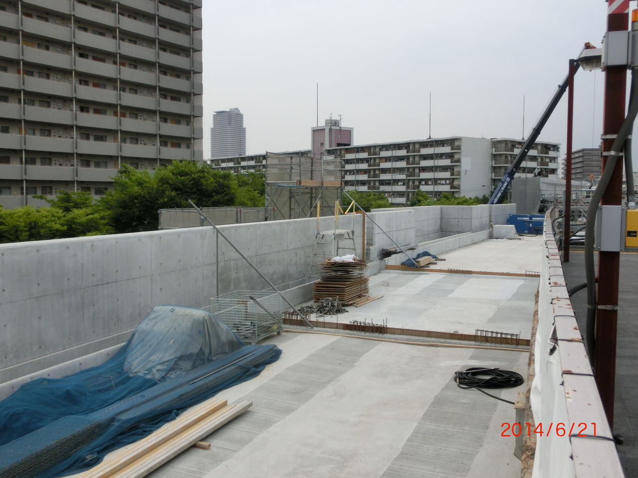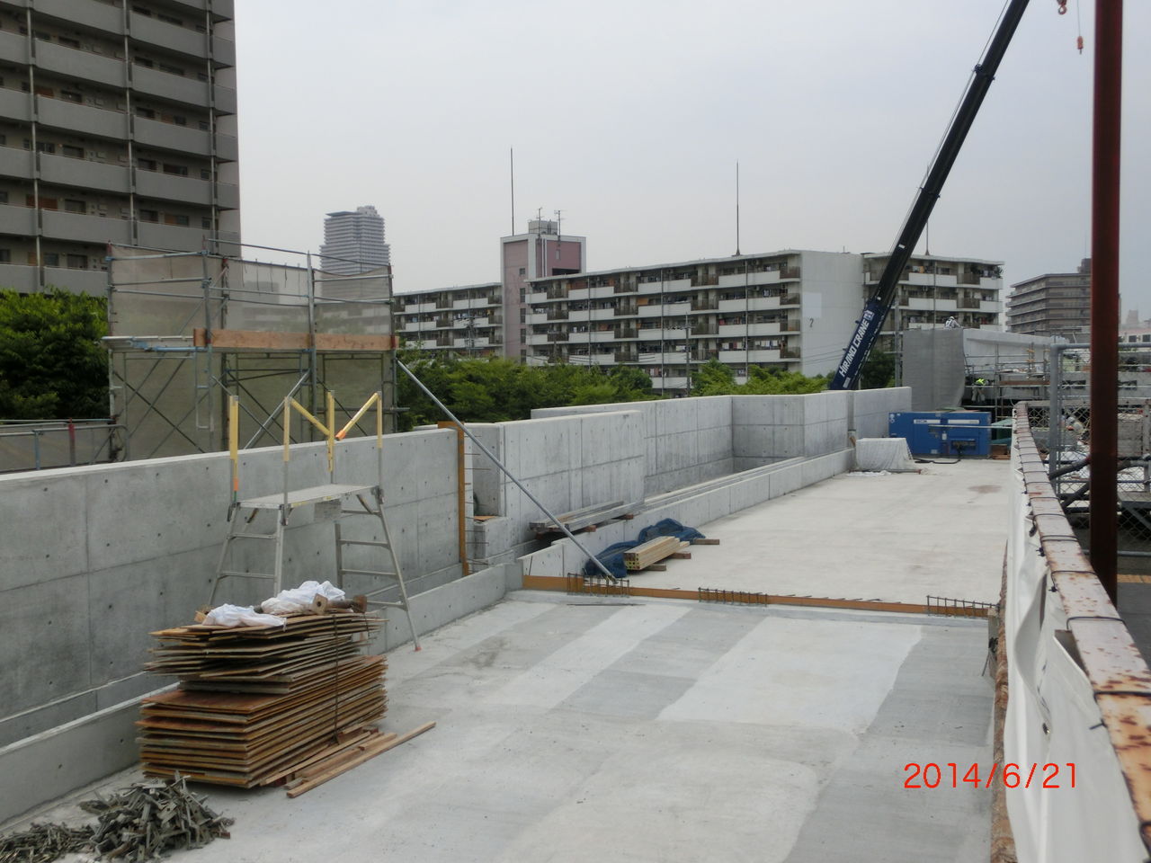 手前に 工事用の細い鉄骨が立てられているのが分かります。