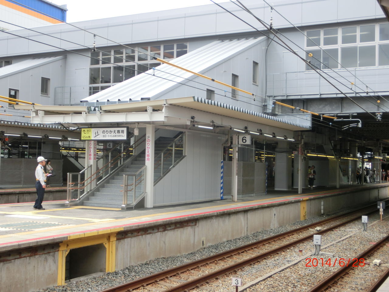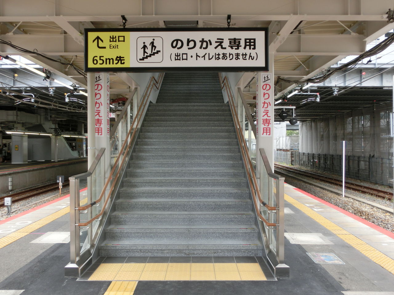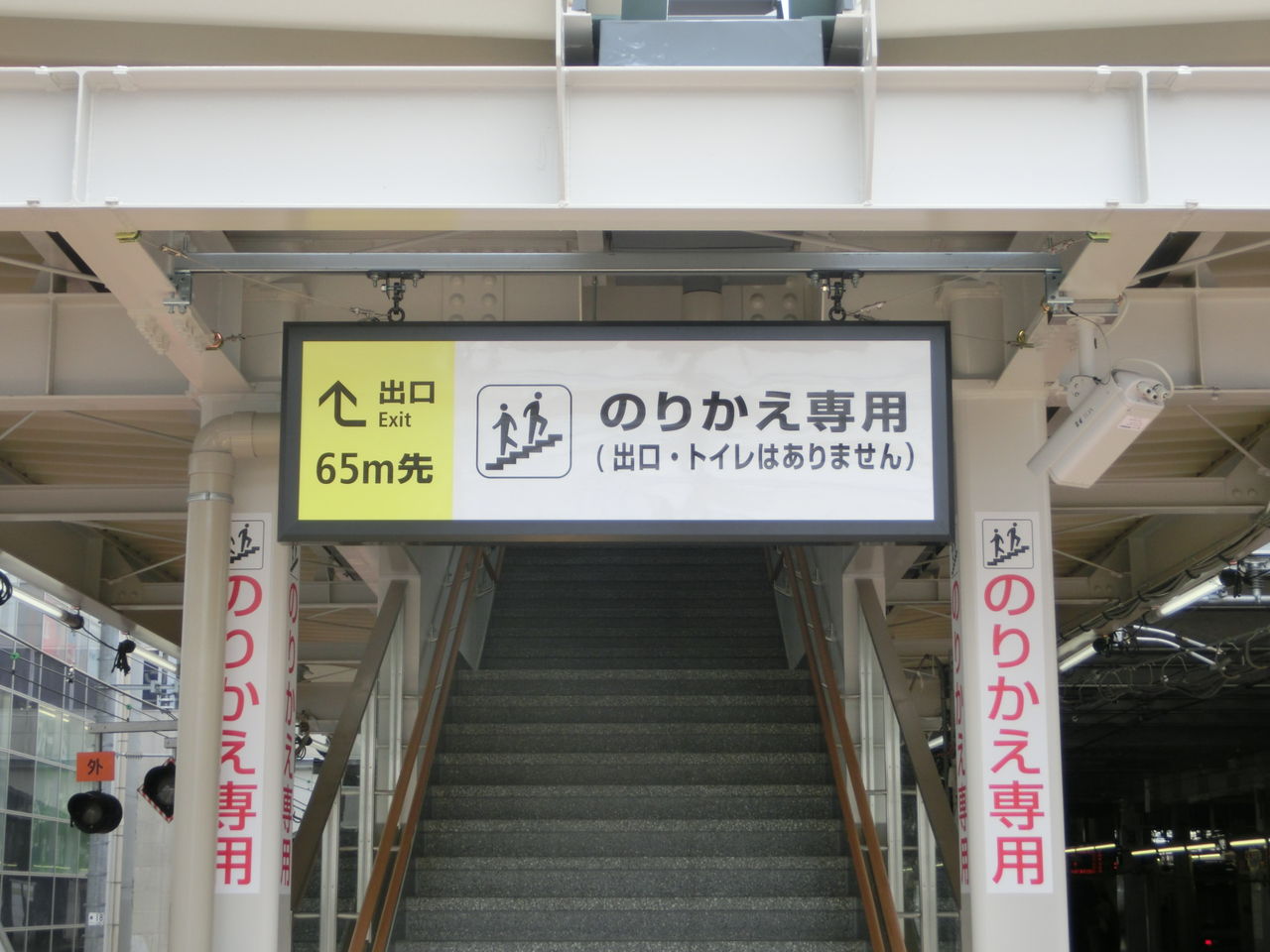 のりかえ専用通路使用開始1週間前に訪れた時、上の写真の駅名標が設置されている辺り一帯が鉄柵で囲まれ、仮設の駅名標が取り付けられていましたが、重機を移動させたためか、今回訪れると鉄柵と仮設の駅名標が撤去されていました。