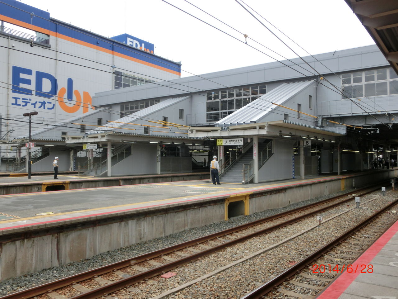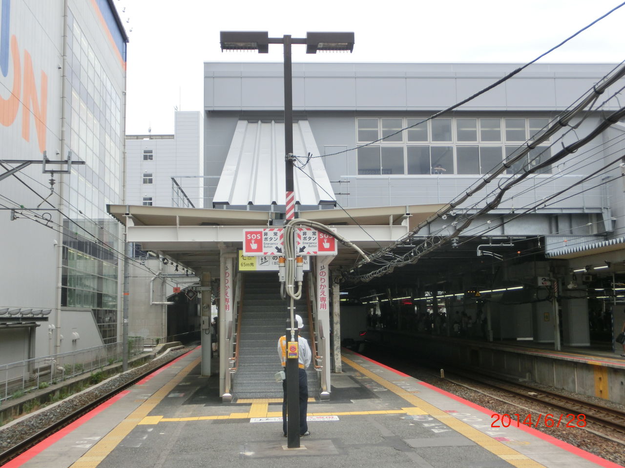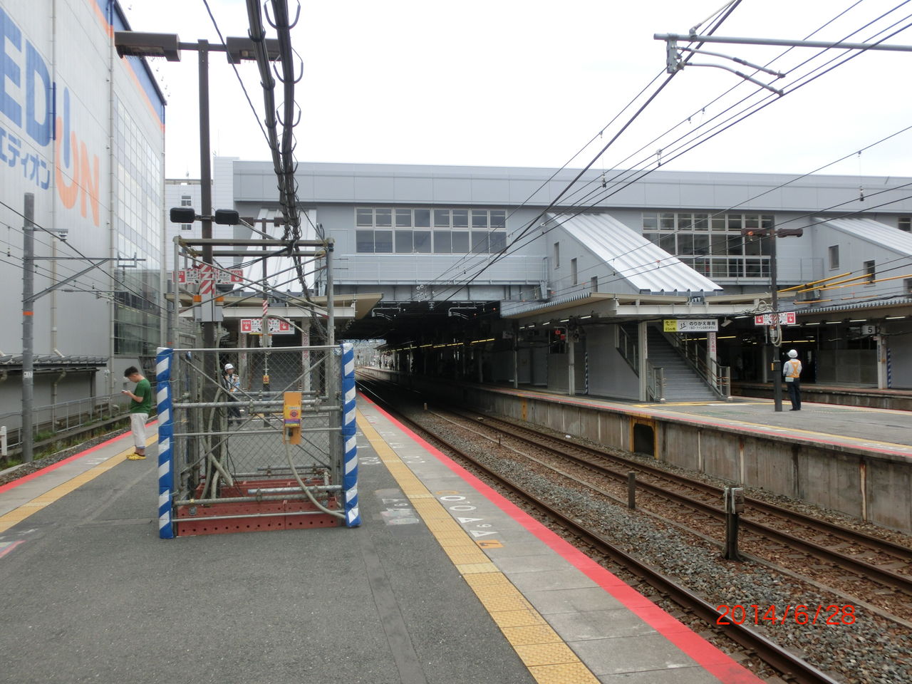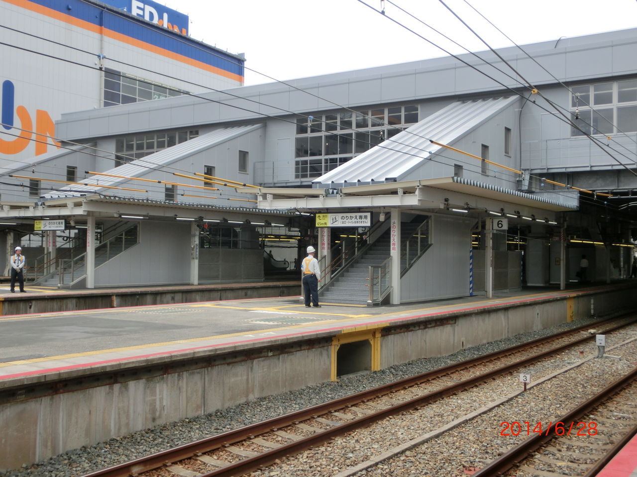 のりかえ専用通路使用開始1週間前に訪れた時、上の写真の駅名標が設置されている辺り一帯が鉄柵で囲まれ、仮設の駅名標が取り付けられていましたが、重機を移動させたためか、今回訪れると鉄柵と仮設の駅名標が撤去されていました。