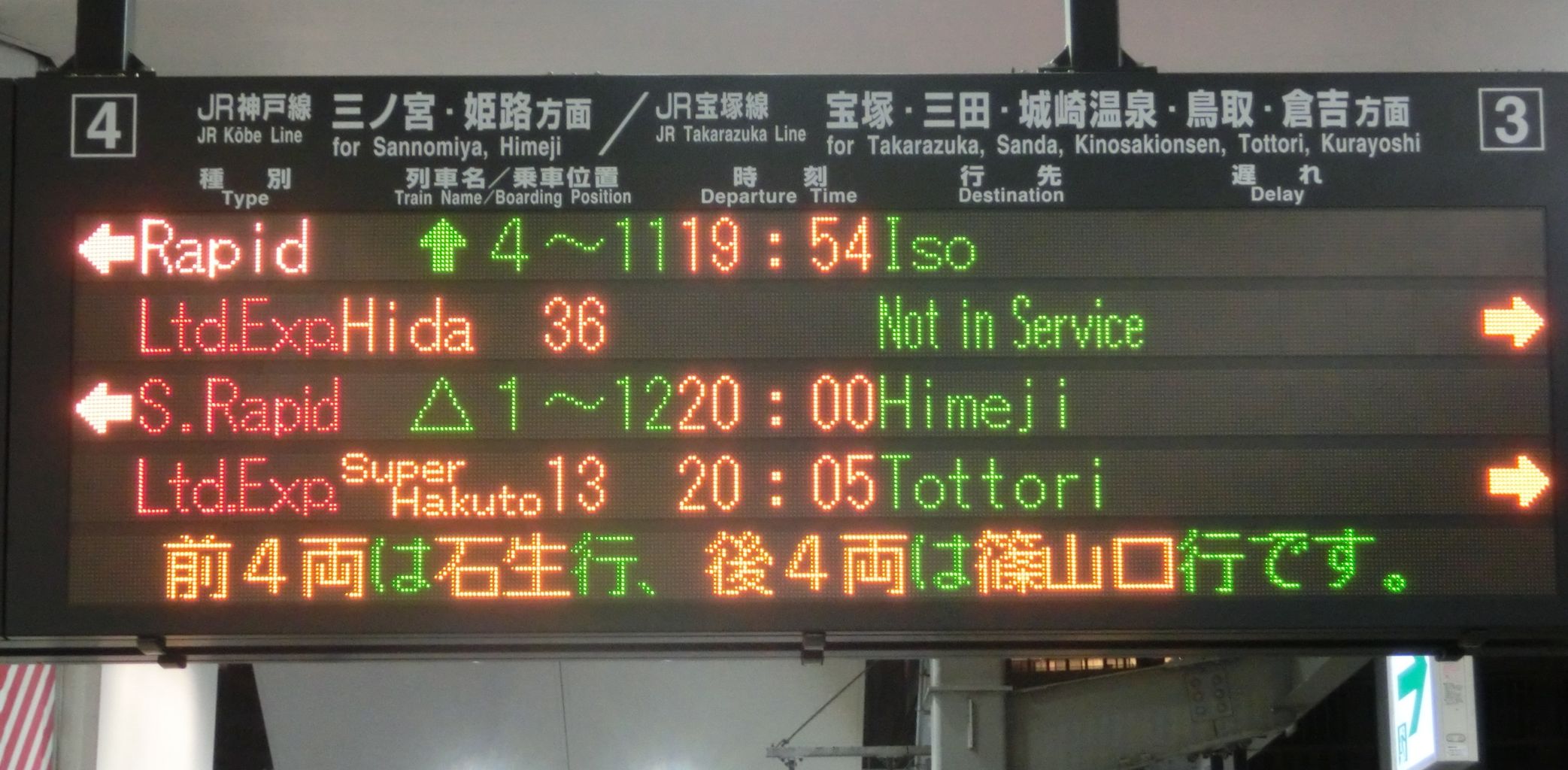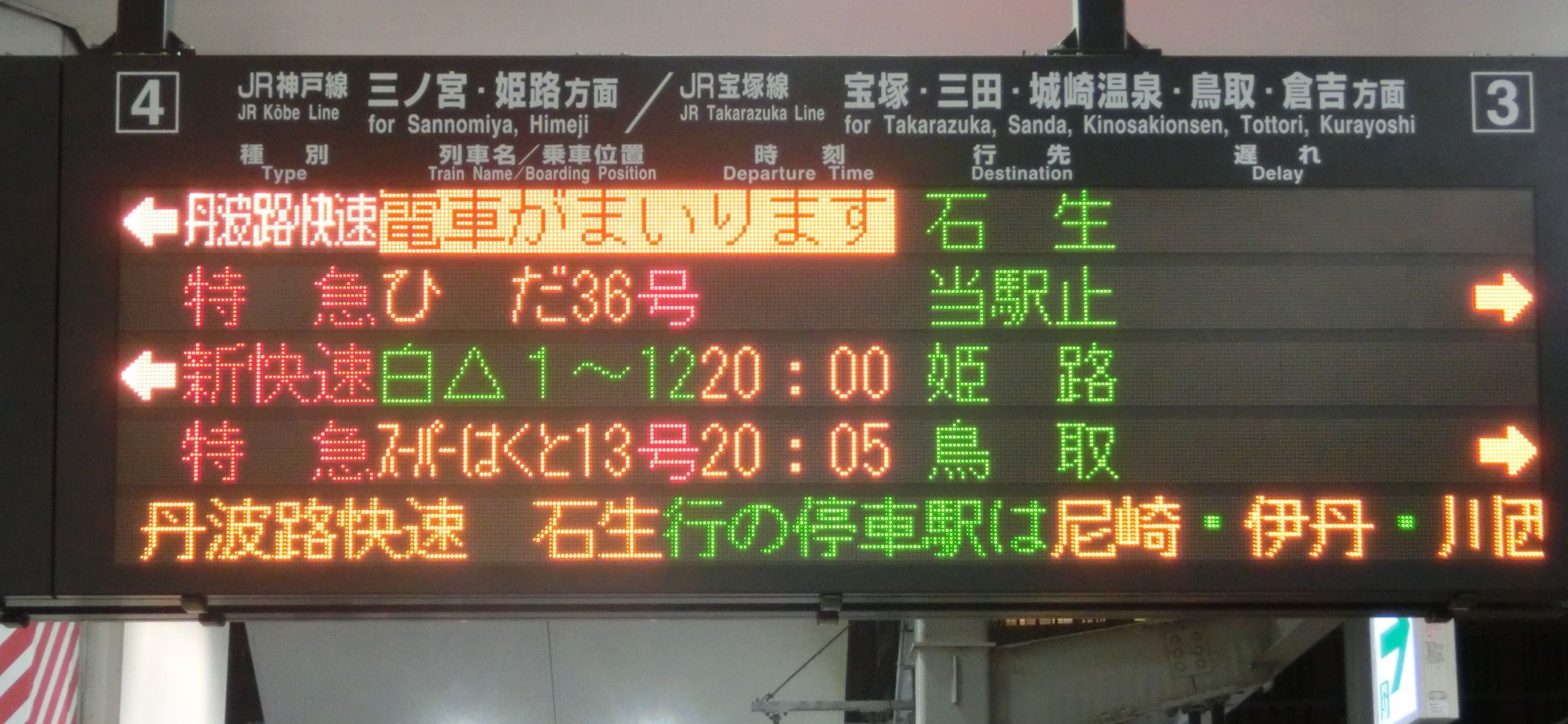 その2駅も、電光掲示板の表示が 尼崎~新三田駅間と大きく異なっています。