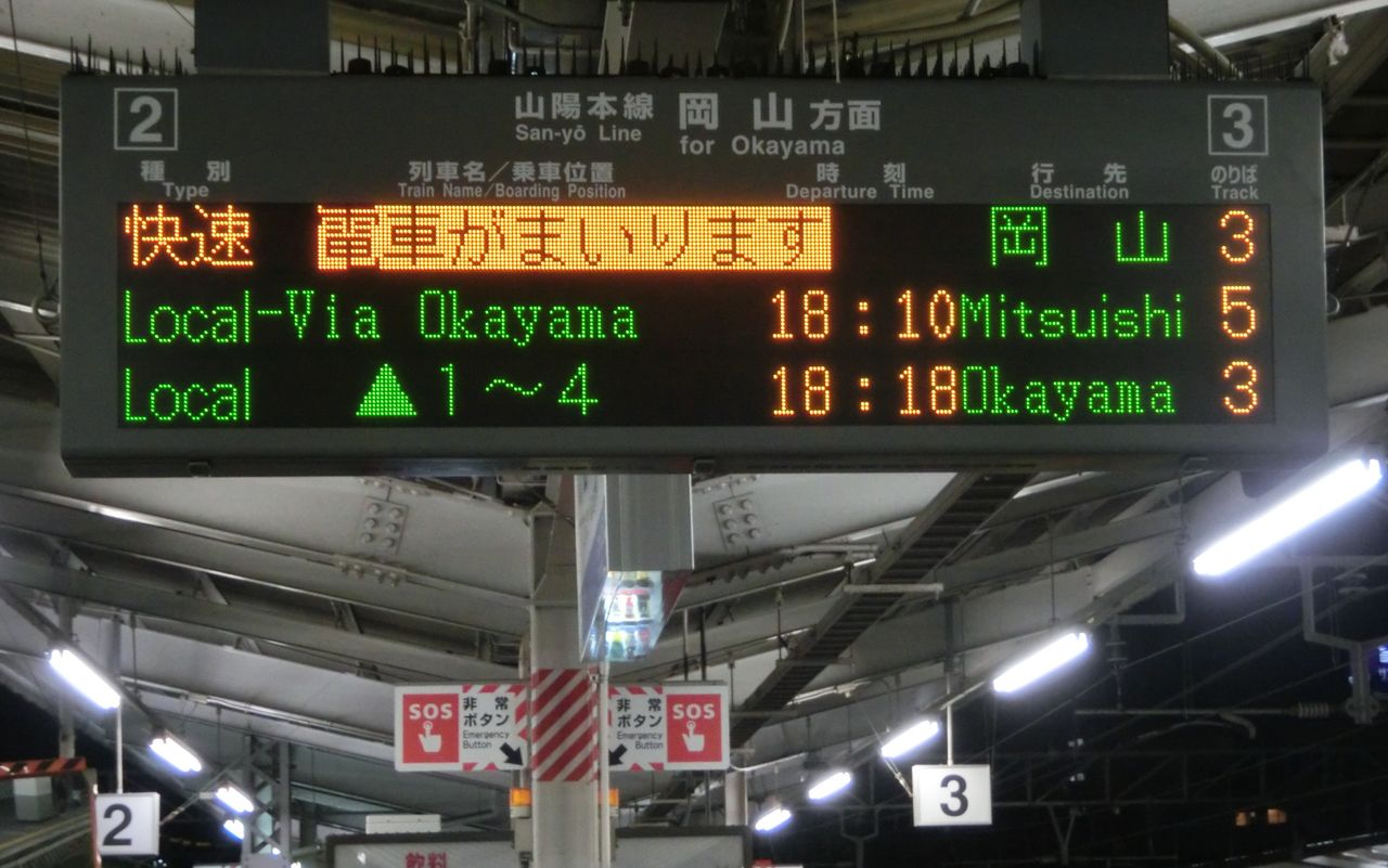 岡山駅を越えて運転される列車は、列車名欄に (岡山駅経由) -Via Okayama と表示されます。