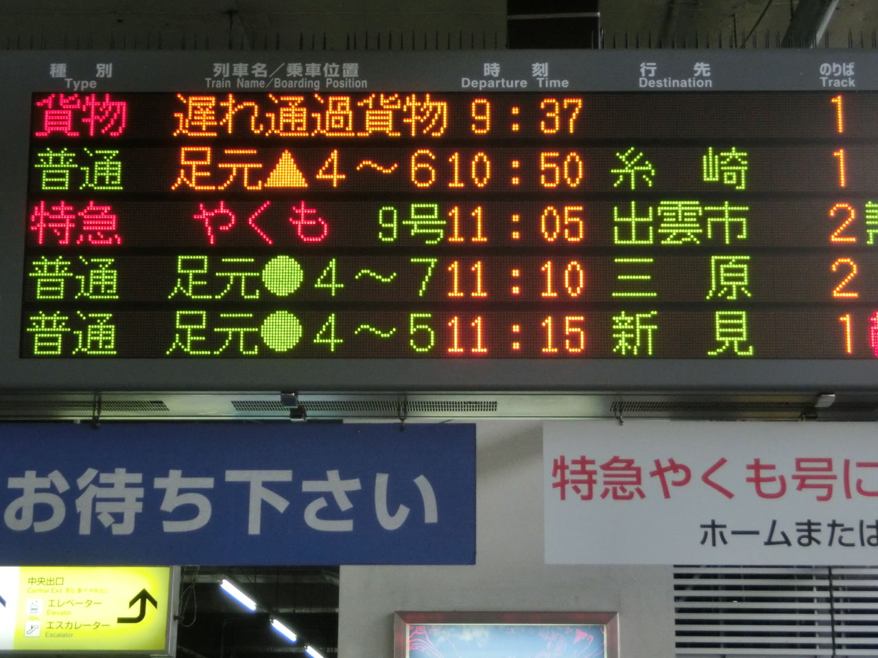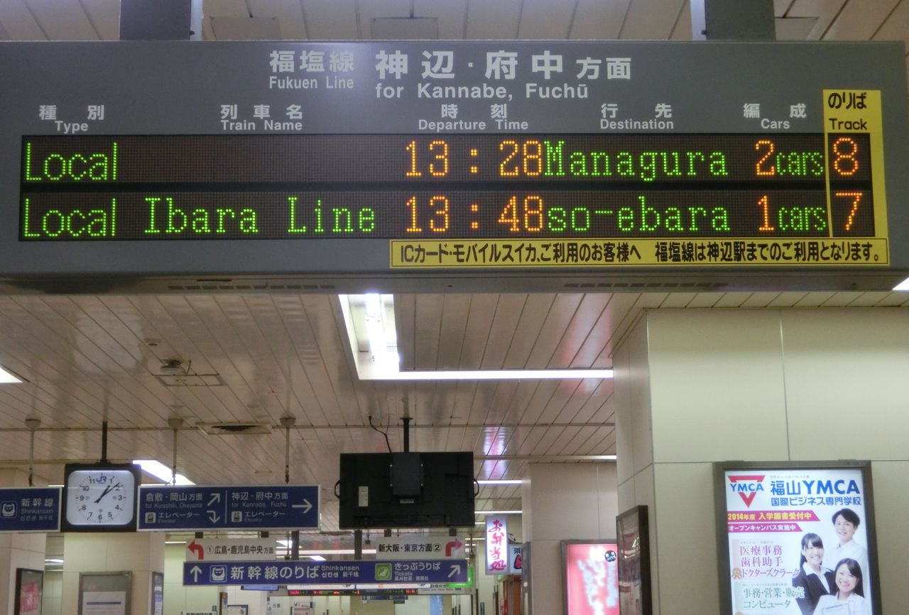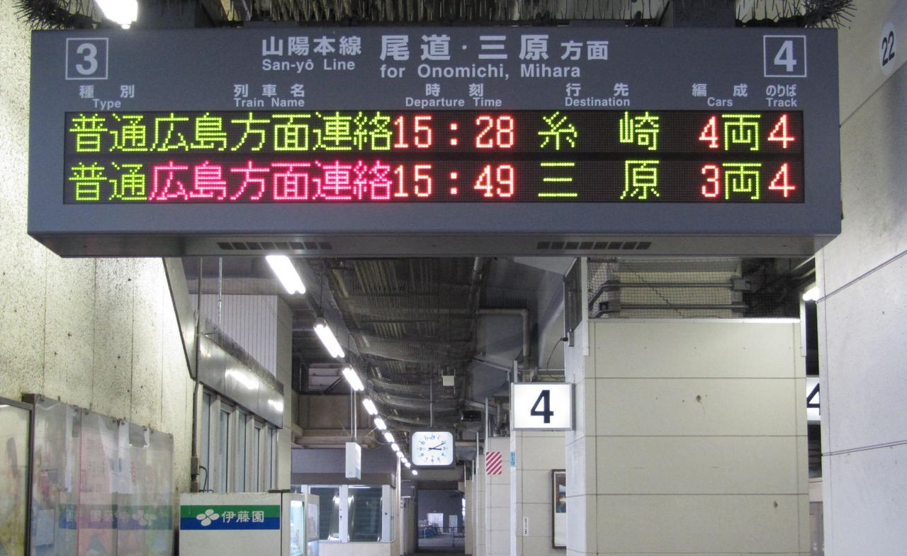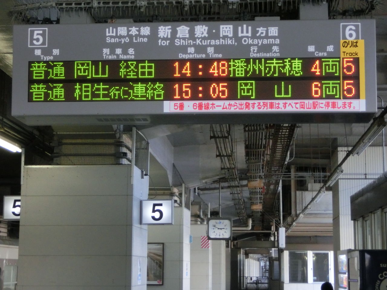 当駅始発・終着の電車が多い糸崎駅をはじめ、主要都市の中心駅である尾道駅・笠岡駅、赤穂線との分岐駅である東岡山駅や、新幹線停車駅の新倉敷駅にも 発車標が設置されていないのです。