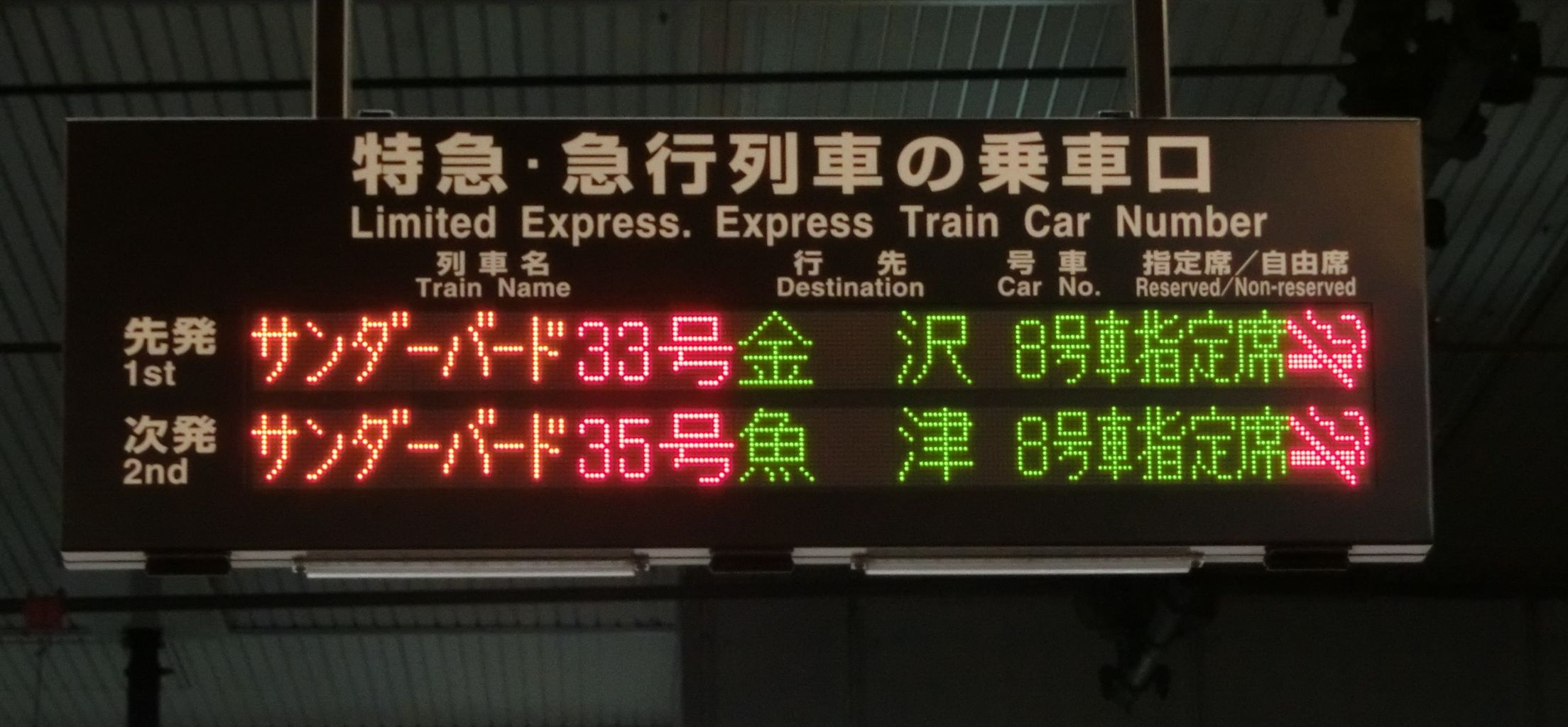 1・2番のりばに設置されている発車標は、このような5段表示のタイプです。