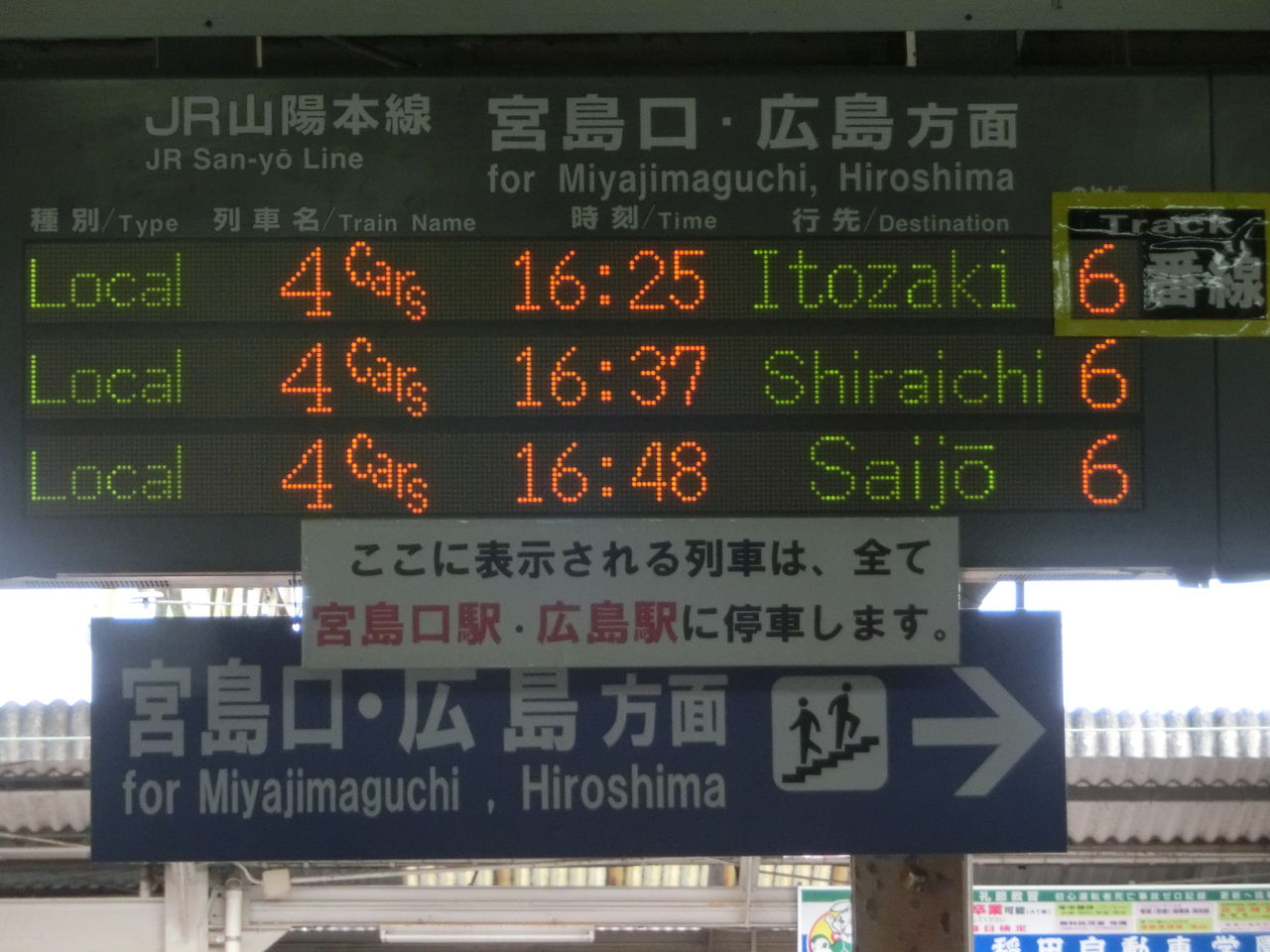 こちらは、山陽本線上り 広島方面行きの発車案内。 3段表示の電光掲示板です。