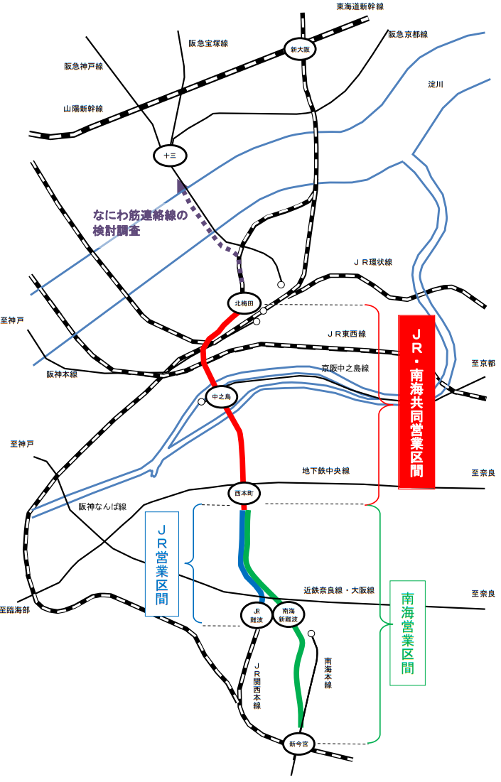 ●途中に 中之島駅(仮称。京阪中之島駅と乗り換え)、西本町駅(仮称)、南海新難波駅(仮称。実質的には南海難波駅の地下ホーム)を設置。