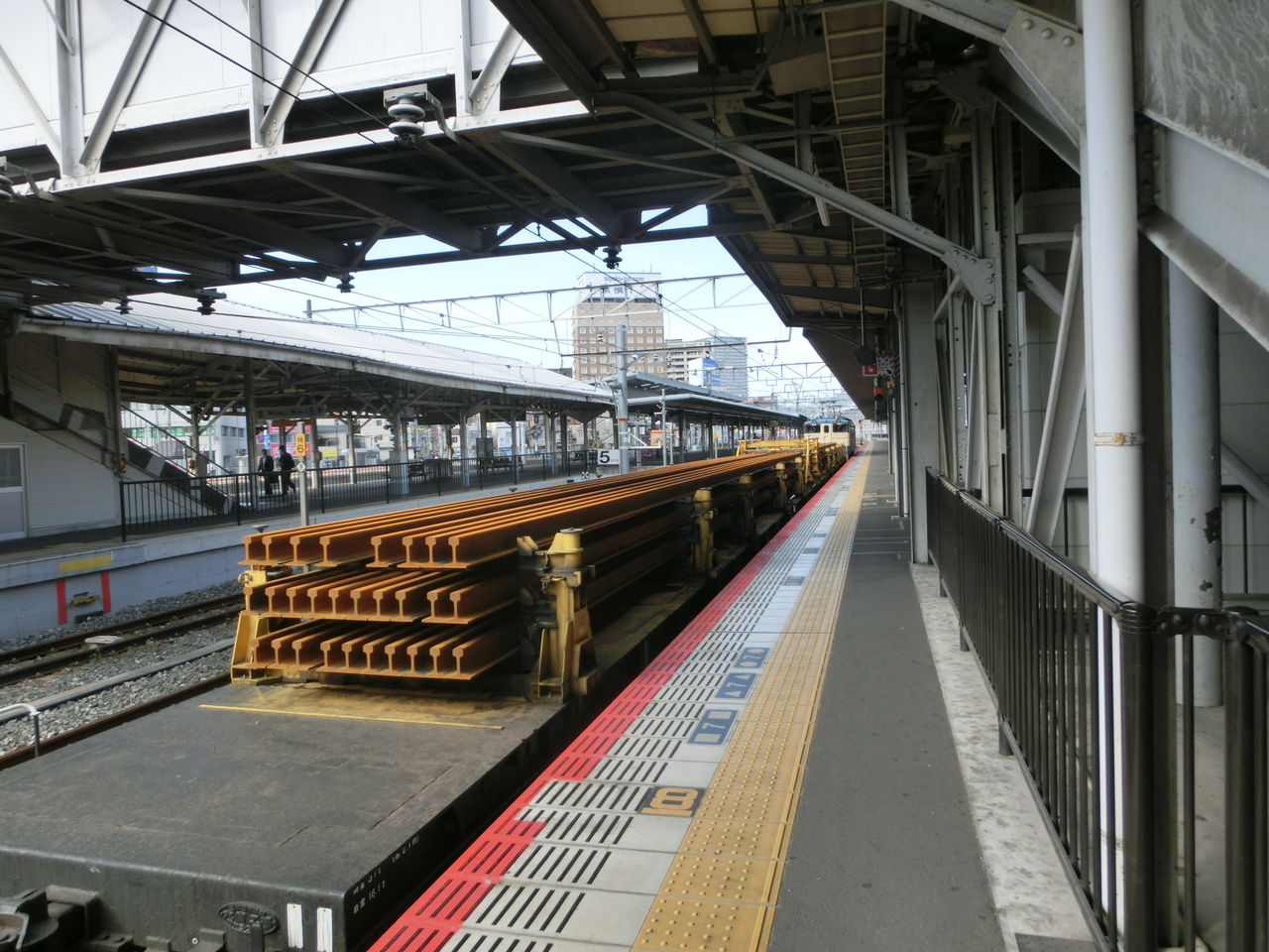 長いレールのようなものが たくさん積まれています。