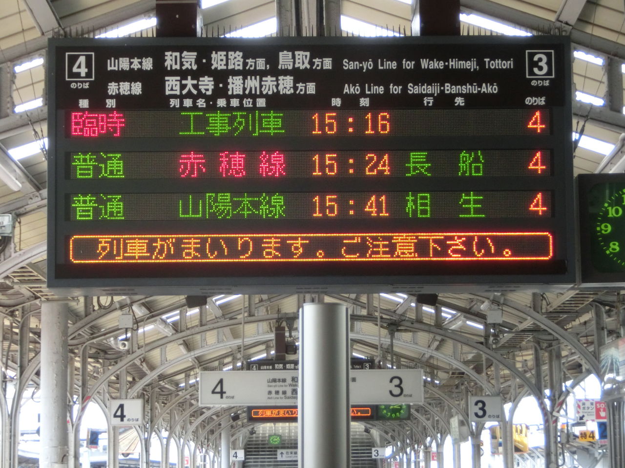4月に岡山駅を訪れた時、ふと 3・4番のりばの電光掲示板を見ると、見たことのない表示が出ていました。