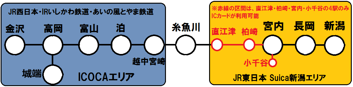 直江津駅は JR東日本のSuica新潟エリアのため、福井県・石川県・富山県の駅からICカードで乗車した場合、ICカードで下車できません。