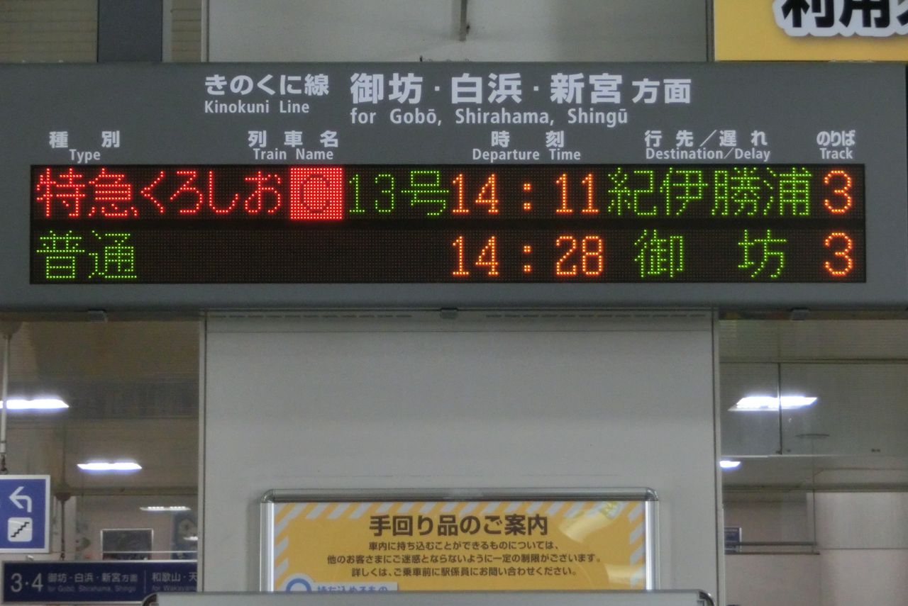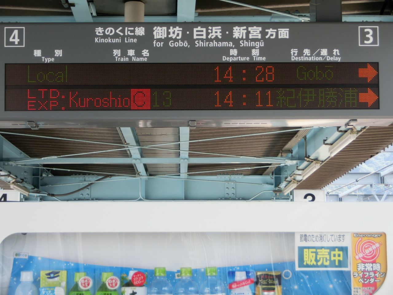 白浜行きが発車すると、紀伊勝浦行きの表示が上の段に表示されましたが、やはり英語表示は出ないようです。