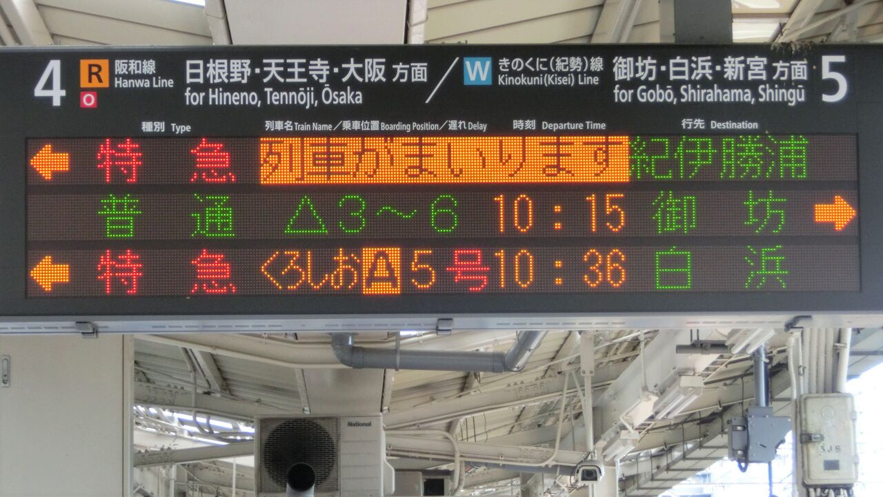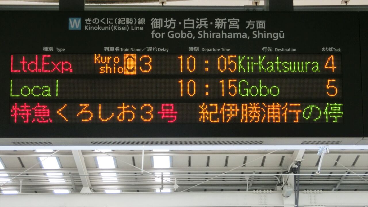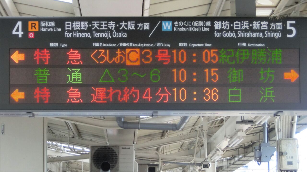 その影響で、特急くろしおは 13:02発の白浜行きと 14:02発の紀伊勝浦行きが大幅に遅れました。