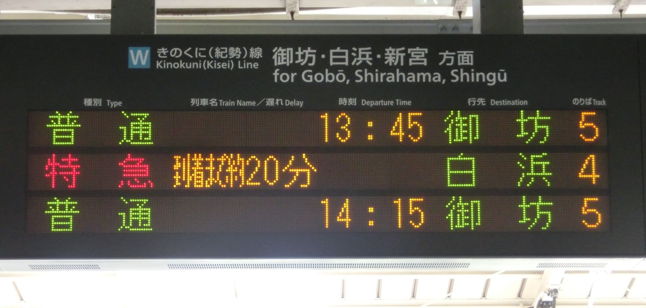 和歌山13:15発の御坊行きに乗る予定だったところを、30分後の13:45発に変更したのですが、14:02発の紀伊勝浦行きは 14:15発の普通電車よりも後に発車するとのこと。