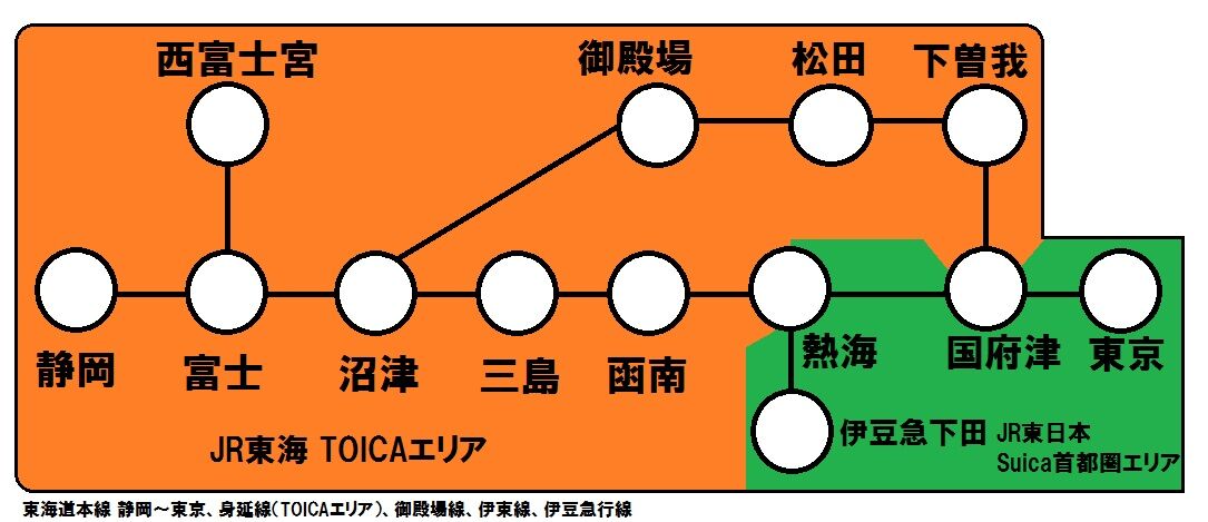 ※JR東日本のSuicaエリア(熱海駅以東)・PASMOエリア(小田急線)とJR東海のTOICAエリア(函南駅以西)を跨いでの利用はできません。