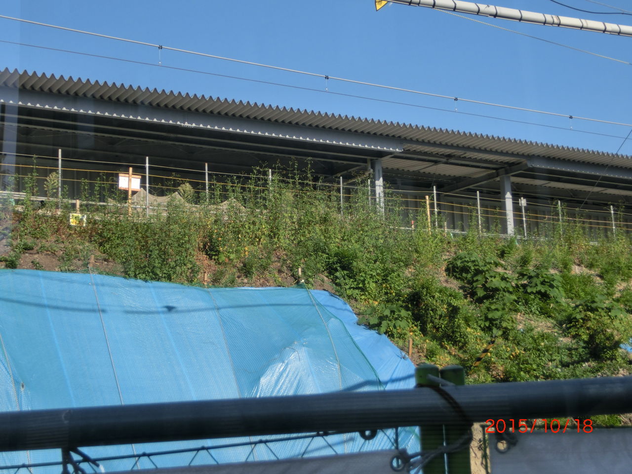 前回の撮影時までは、斜面が見えないくらい 鬱蒼と木々が生い茂っていましたが、線路脇の斜面に生えていた木のほとんどが伐採されて、手前の木だけ残っています。