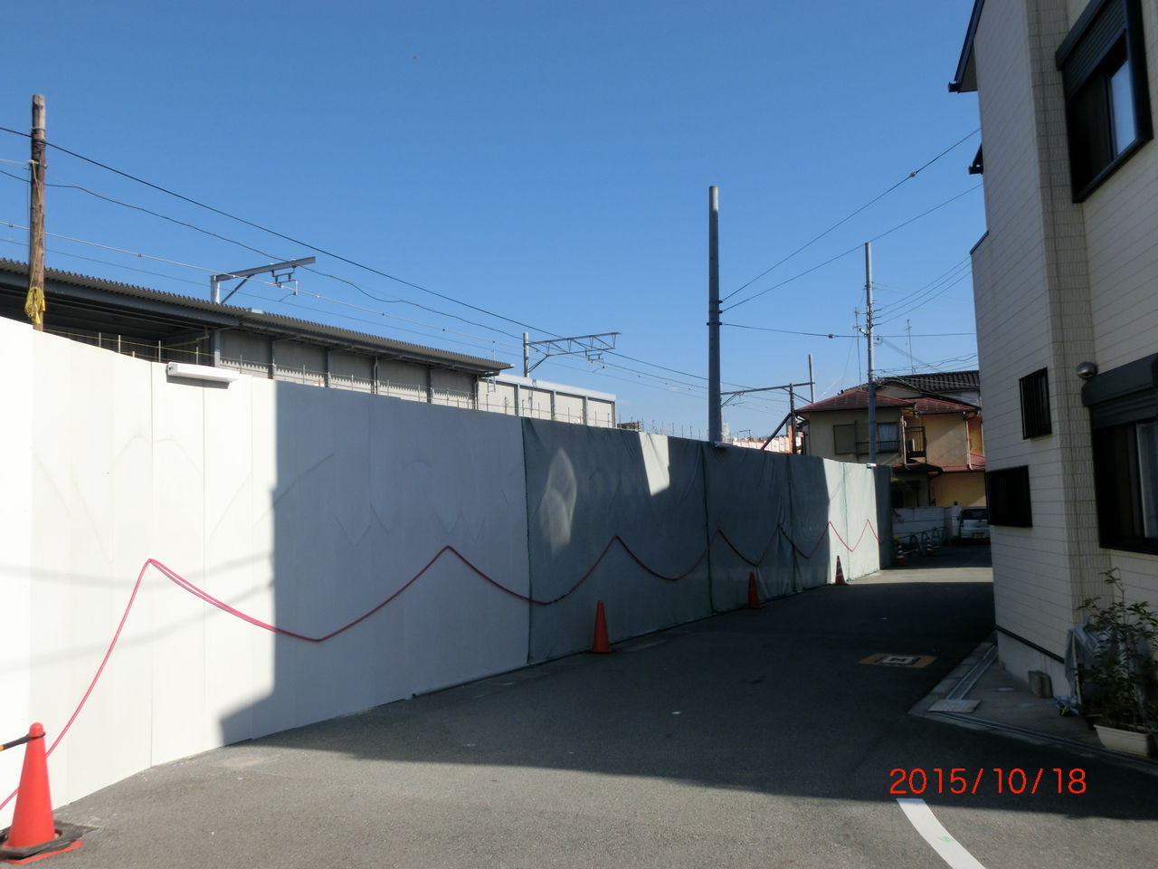 線路沿いに鬱蒼と生い茂っていた木々が全て伐採され、工事用の白い壁や柵、単管バリケードなどで囲まれていました!