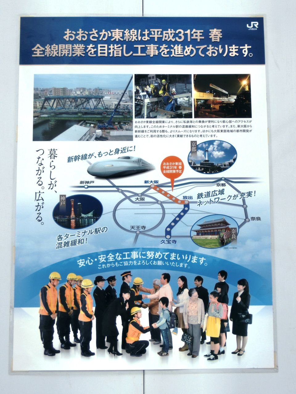 白い壁には、おおさか東線建設のポスターが掲示されていました。