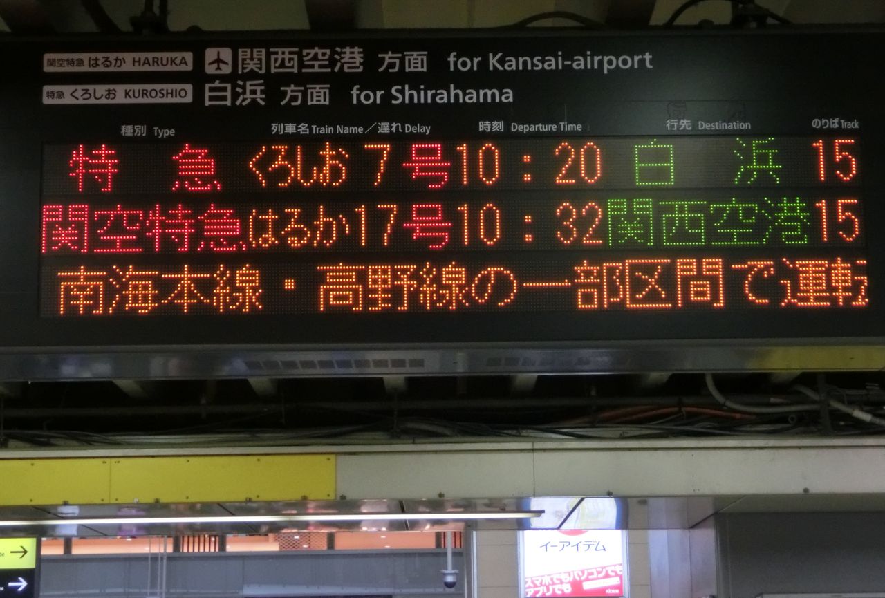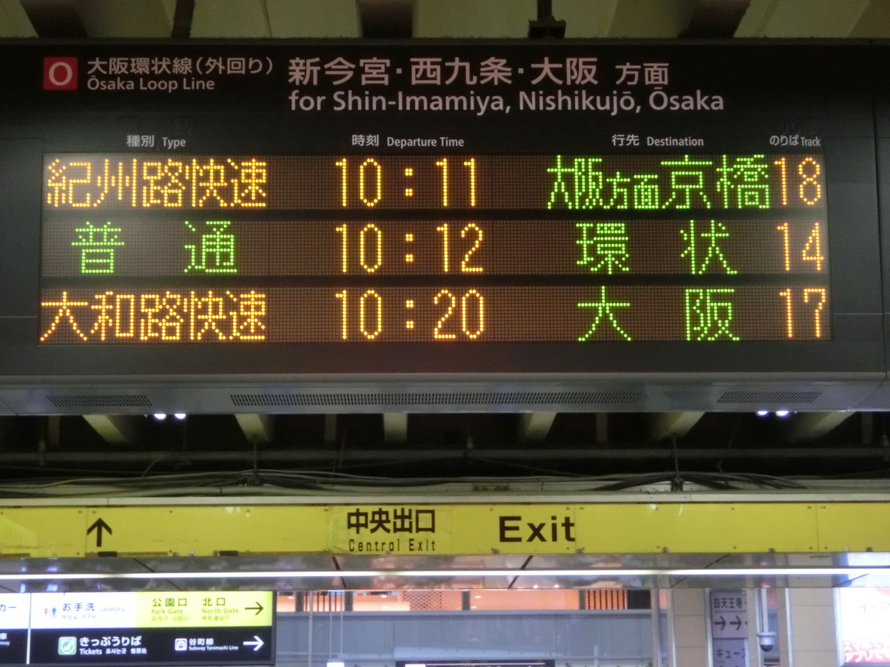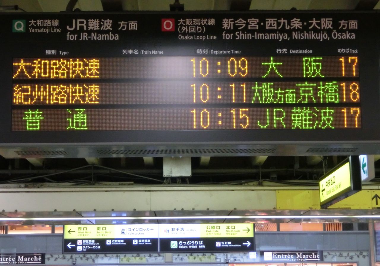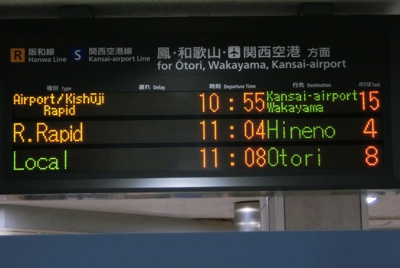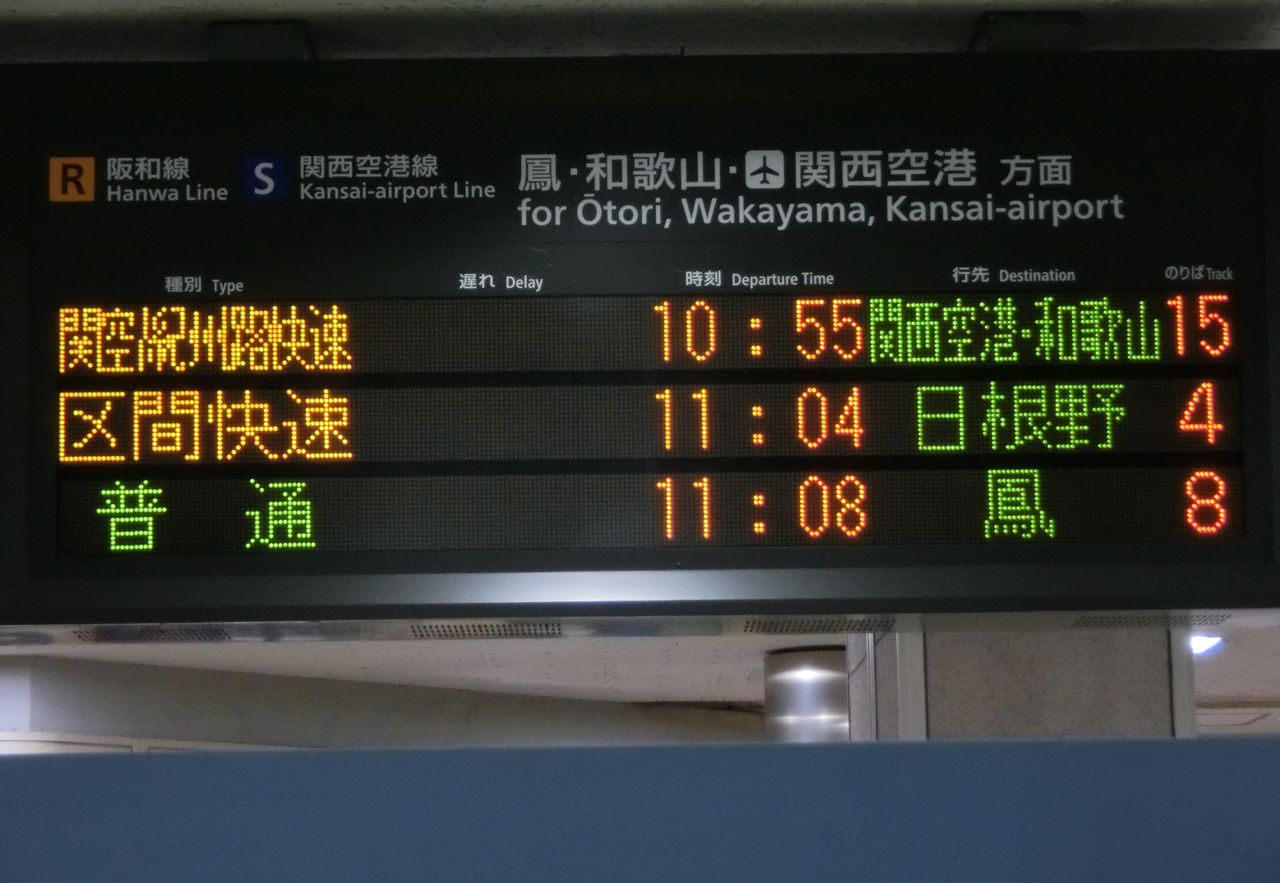 まずは、中央口改札に設置されている電光掲示板を 右側(阪和線ホームに近い方)から順に見ていきましょう。