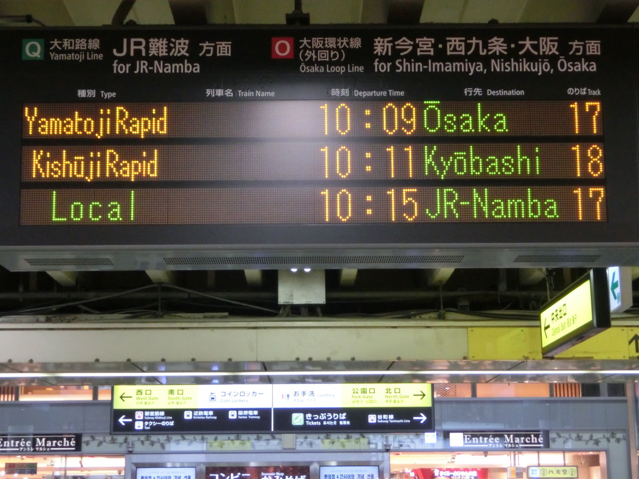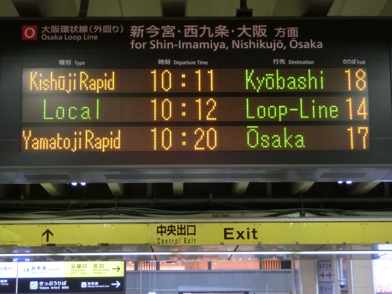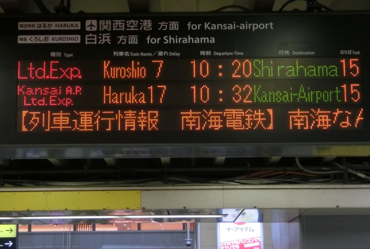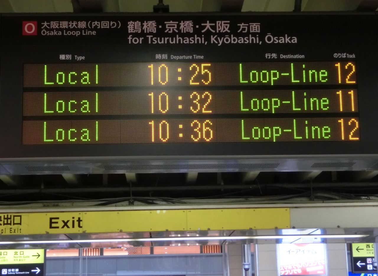 まずは、中央口改札に設置されている電光掲示板を 右側(阪和線ホームに近い方)から順に見ていきましょう。