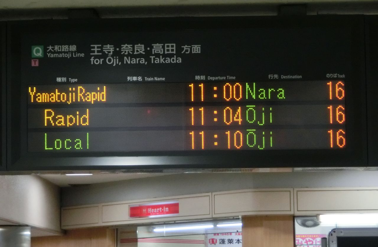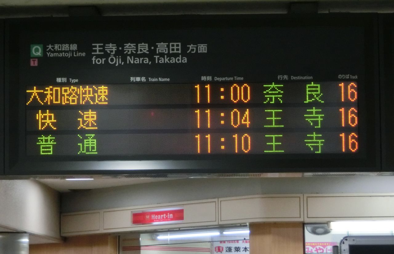 一番左側にある 大和路線 JR難波方面の発車案内から見ていきます。