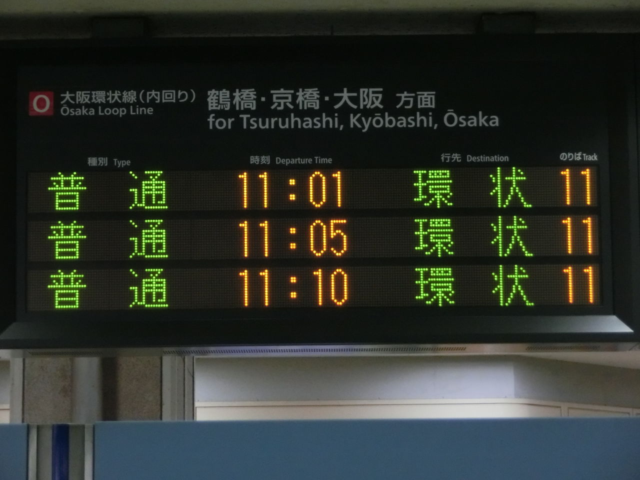 大阪環状線 内回りの発車案内。 列車名欄がありません。