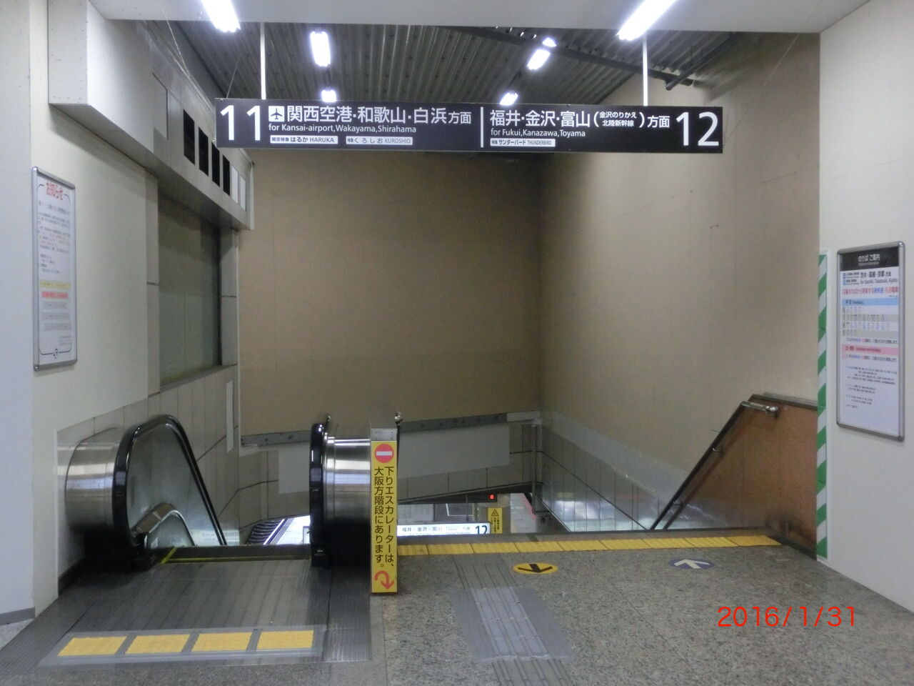 ホームへ下り、京都側の階段を撮影。 上りエスカレーターが併設されています。