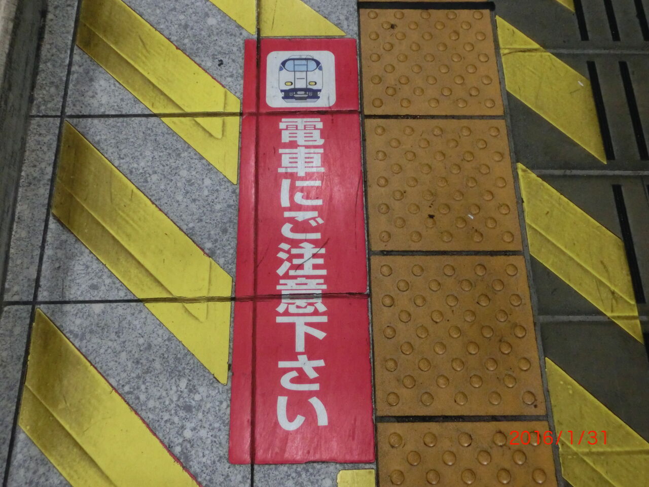 ホーム床には、「電車にご注意下さい」 と書かれたステッカーが貼ってありました。
