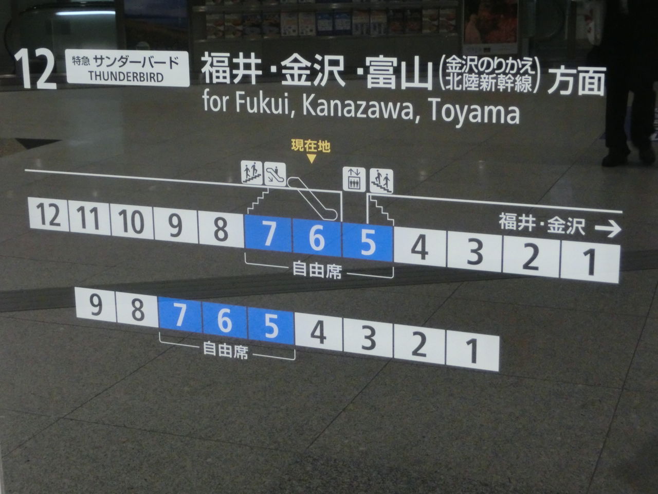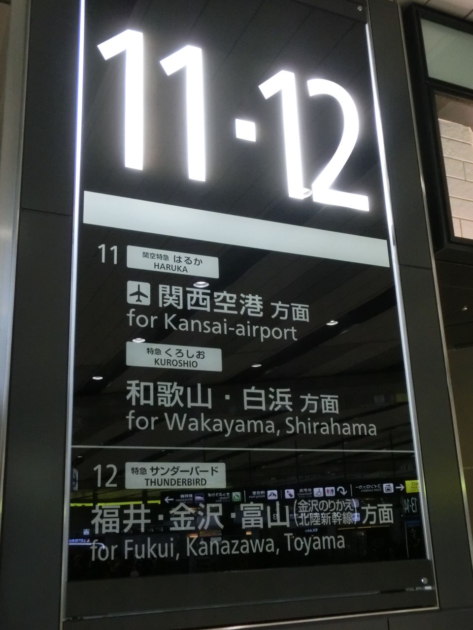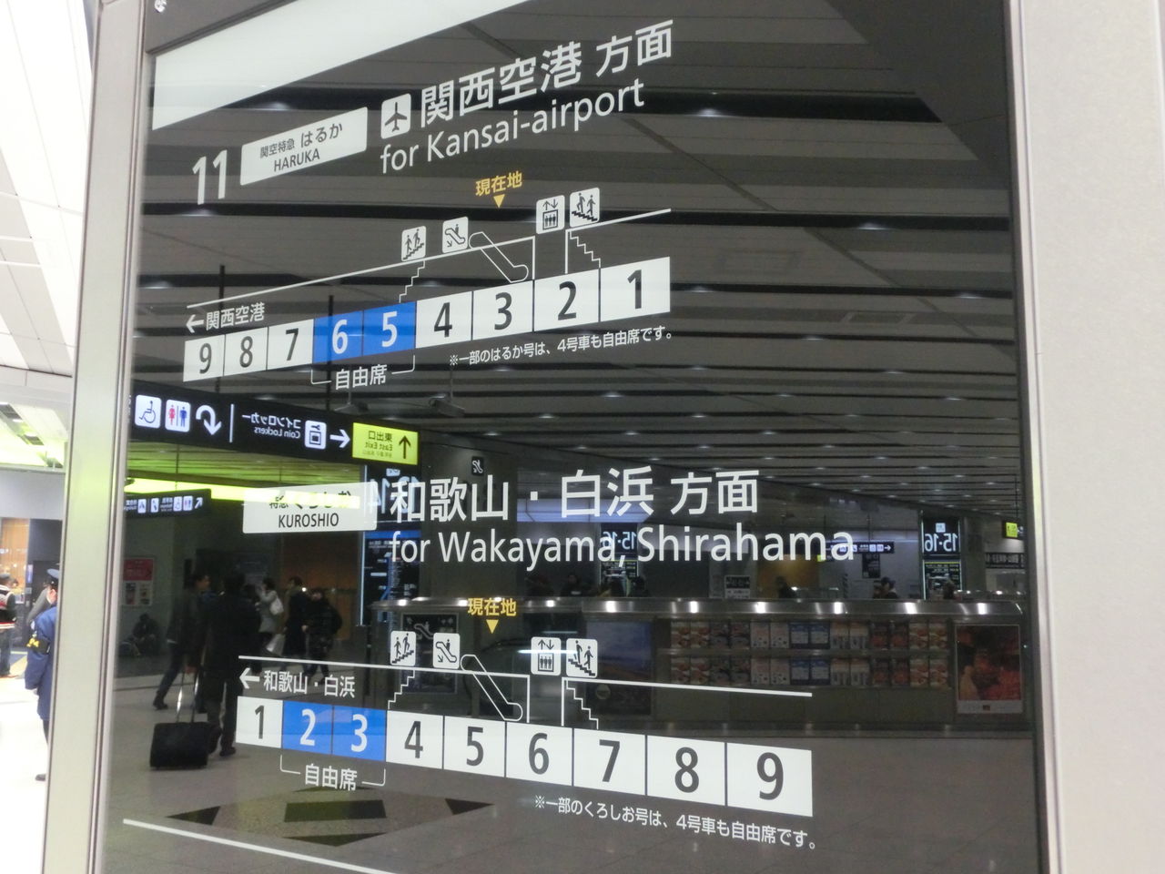 柱には、特急はるか・くろしお・サンダーバードが ホームのどの辺りに停車するのかが分かりやすく案内されています。