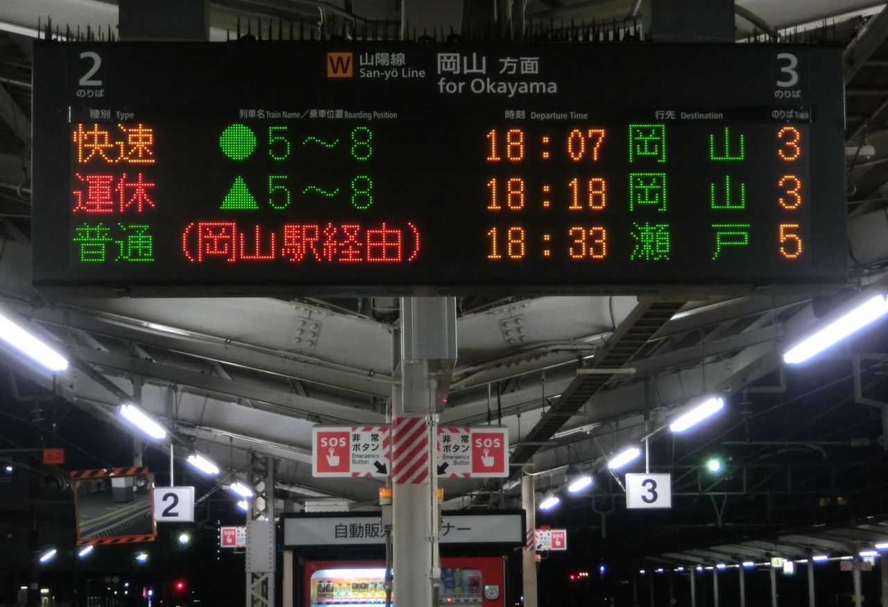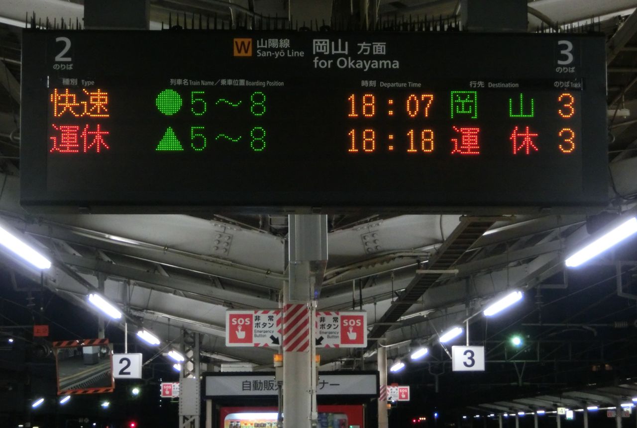 「運休」 表示は、広島の横川駅で 見たことがありましたが、岡山地区の発車標にも出るとは意外です。