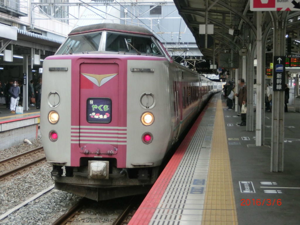 ※岡山駅3番のりばに到着した 特急 「やくも」(381系)。