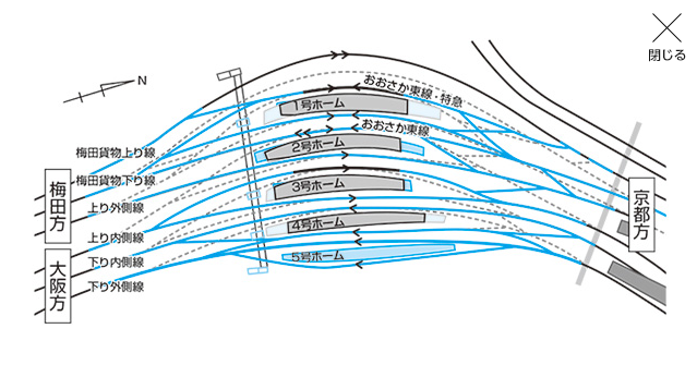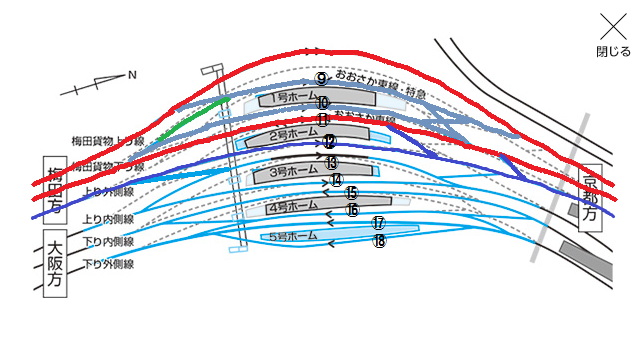 また、梅田貨物線の下り線から JR京都線の上り外側線への渡り線が京都側に増設され、9番のりばから JR京都線の上り外側線へ出ることも可能になります。