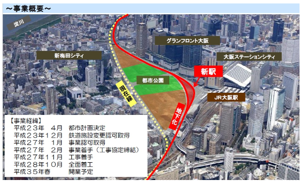 2016年10月12日、JR西日本は 「10月定例社長会見 」 で、大阪駅の北側を通る 東海道本線の支線(通称:梅田貨物線)の地下化と新駅(仮称:北梅田駅)の設置工事を 2016年10月から全面着工すると発表しました。
